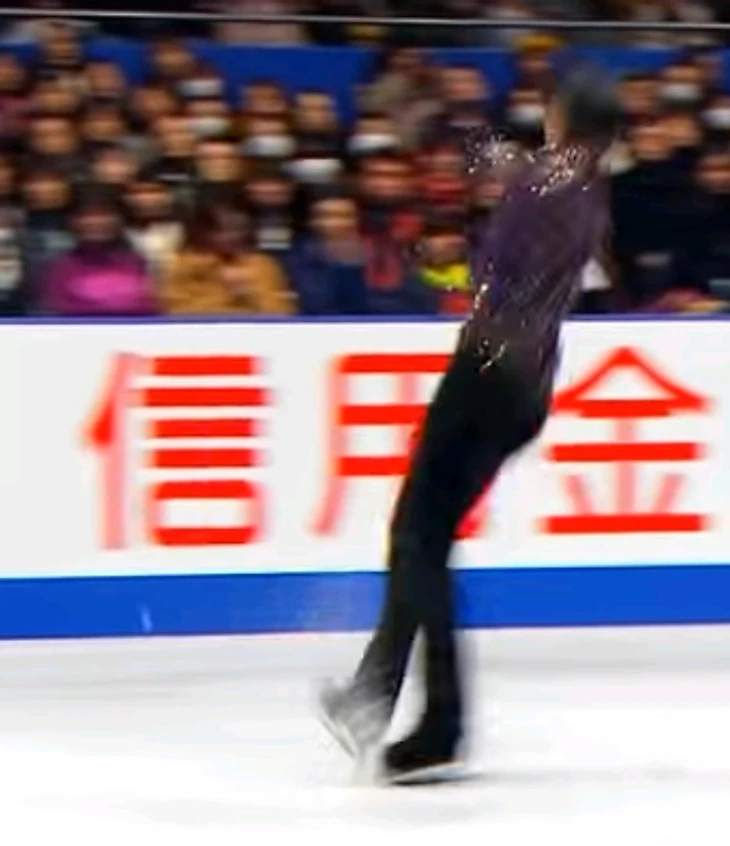 Юзуру Ханю, отрыв с тулупа в каскаде 4T+Eu+3S там же (с хода вперед - т.е. прер составил почти половину оборота на льду):