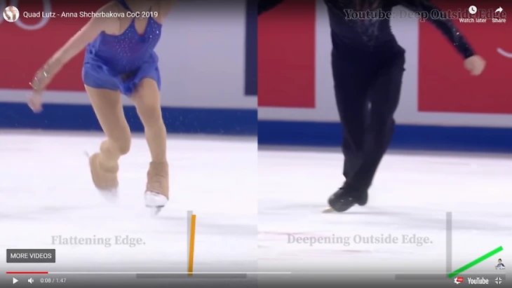 А в качестве доказательства дефектного лутца Ани Морфеус приводит видео, на котором хорошо видно, что в момент удара зубцом об лед, т.е. take-off, у Ани внешнее ребро на лутце: