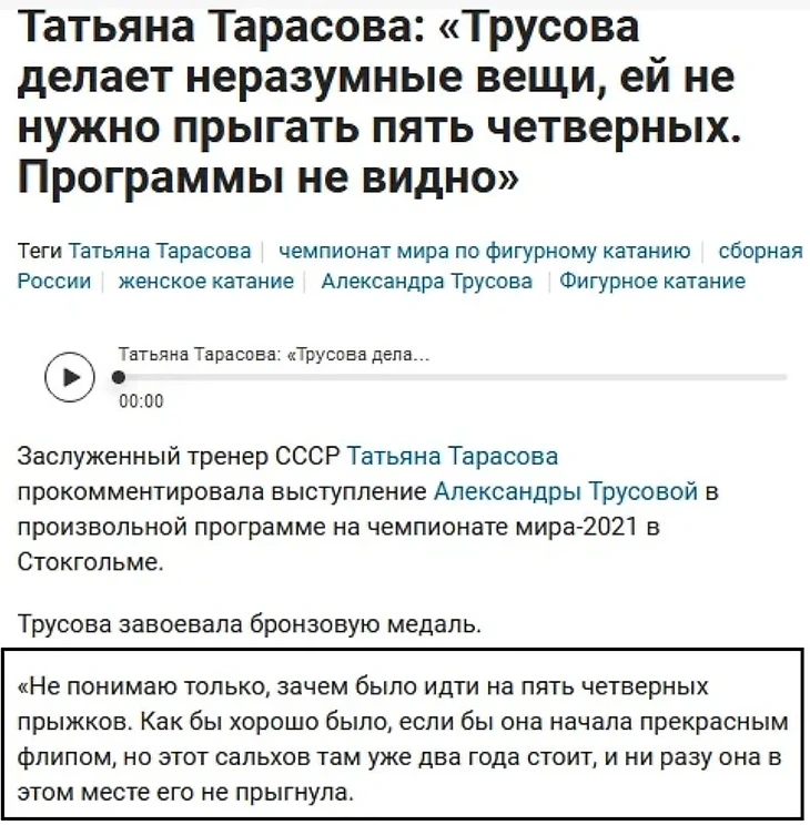 За последний сезон мы узнали огромное количество мифов о мультиквадистке Александре Трусовой. Самый популярный из них – «Саша квады растеряла, вот и вернулась к Тутберидзе», мне лично доводилось читать такие ответвления как: «Ни разу не видели в этом сезоне флип и сальхов» или «Показала лишь лутц». Даже Татьяна Тарасова поспособствовала распространению данного мифа.