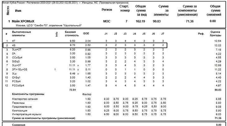 Удивительно, но я согласна и с ГОЭ за сальхов Саши, и с ГОЭ Майи, хотя любопытно то, что 4Т более худшего качества Майе Хромых оценили выше.