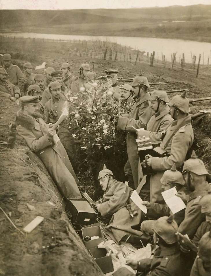 Поздно вечером в канун Рождества немецкие войска начали разворачивать подарки из дома, многие из бойцов получили рождественские елки со свечами. Когда немецкие солдаты зажгли свои фонари и выставили их на краю своих окопов, раздалось рождественское пение.