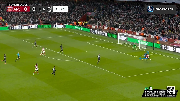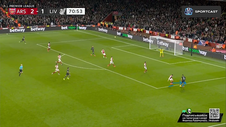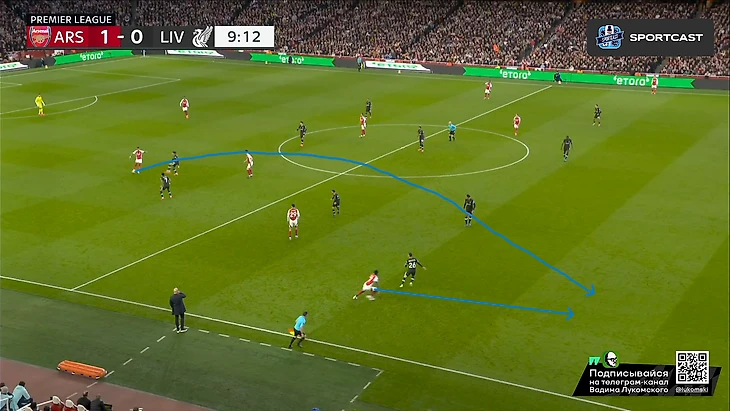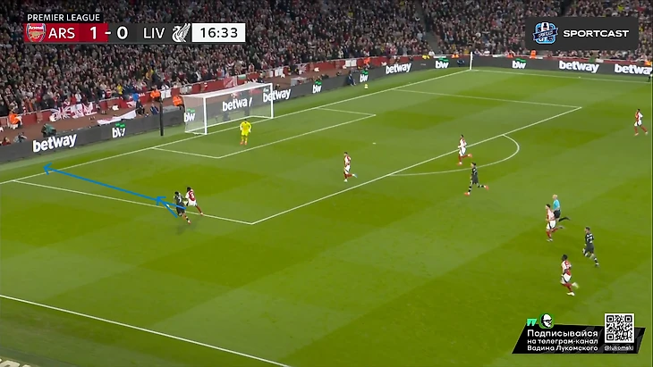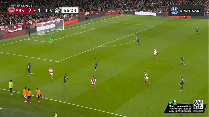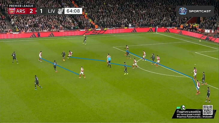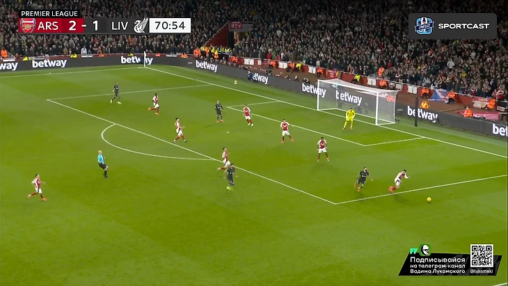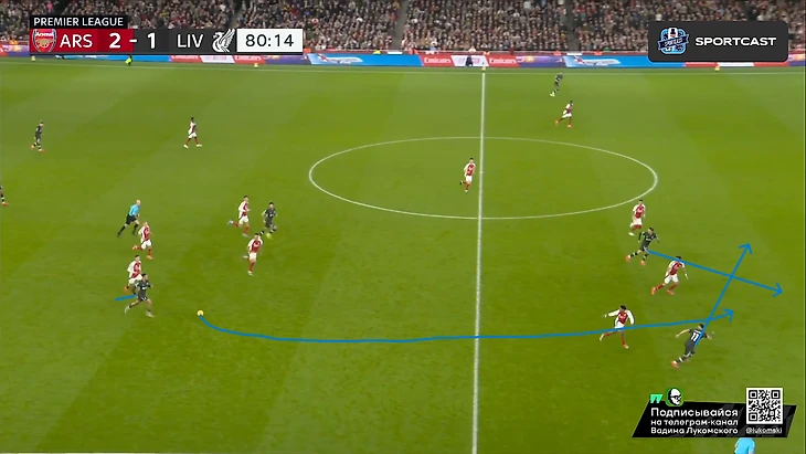 Само собой, нельзя еще не отметить высочайший класс Букайо Сака буквально в каждом действии из этого эпизода: начиная от мастерского зацепа за линию офсайда (привет вчерашнему Мбаппе), ведь линия обороны у «красных» тоже была отнюдь не самой низкой, заканчивая столь легкой отправкой Робертсона «в буфет» буквально одним движением и правильной интерпретацией позиции Келлехера, которая позволяла свободно бить в ближний угол на силу, что Сака и сделал Но все же, как бы не был хорош Букайо, пас Уайта даже с достаточно неудобной для него позиции центербека, но главным виновником произошедшего все равно является Эндрю, который в пух и прах проиграл дуэль Саке в этом моменте, хотя мог предотвратить гол просто соблюдя линию, ведь тогда бы Букайо бы просто попал в офсайд, а про несуразное исполнение последующих его попыток вырвать таки это злосчастный мяч из ног соперника я вообще молчу. Дальше по хронологии: «Ливерпуль», пусть и создал видимость моментального натиска на ворота соперника, но это была именно что видимость, ведь попытки подобных накатов все же были достаточно ленивыми и без особого обострения, хотя в подобные моменты в этом сезоне «мерсисайдцы» уже не раз включали некое подобие Клопповского режима и всячески сеяли хаос в обороне (и не только) соперника, вспомнить хотя бы последний тур с «Челси», где после пропущенного в самом начале второй половине, «Ливерпуль» именно таким финтом добыл победу, и гол Джонса тогда стал настоящим шоком для, казалось бы, воодушевившегося коллектива подопечных Марески. Однако сегодня «Ливерпуль» поступил едва ли не полностью противоположенным образом, и не сказать, что Слот был не прав, ведь такой подход результат все-таки принес, пусть и мало что предвещало: