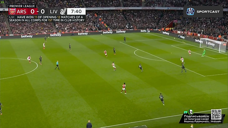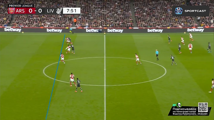 Нередки были и вот подобные ситуации, когда гости чуть ли не в полном составе оказывались за линией мяча и давали сопернику спокойно раскатывать мяч по своей половине лишь с формальным обозначением прессинга. И безусловно, подобная смена стиля, очевидно, была не очень удобно игрокам «красных», и дело не только в многолетнем прибывании Юргена в клубе, но и в том, что и Арне Слот-то ставит абсолютно другой футбол, и что бы «мерсисайдцы» настолько отдавали инициативу в руки соперника, мы увидели впервые в этом сезоне. Но были у такого подхода и плюсы: несмотря на бесконечное неудобство этой формации, свободных зон у хозяев, все-таки, было архимало, если они были вообще, и в принципе, здесь устоявшаяся футбольная догма «команда, которая выходит на поле с только с мыслями о ничьей обязательно проигрывает» вполне могла и не сработать, ведь если бы так все и продолжилось во второй половине, далеко не факт, что нейтрализация «Арсенала» в его же стенах была бы менее эффективной, чем она получилась в первой половине. И еще одна интересная деталь: огромная часть первого тайма после пропущенного гола гостями гола, была, по сути, абсолютно бессмысленными и бесполезными попытками «канониров» вновь и вновь пробиться через правый фланг, где уже разок удалось пробиться в начале. Но весь юмор в том, что вся тактика «Ливерпуля» в первой половине, особенно после забитого, была спланирована с одной лишь целью: не наступить на свои же грабли, поэтому данная «дырка» была зашита буквально сразу же, причем так, что пройти там стало практически нереально: