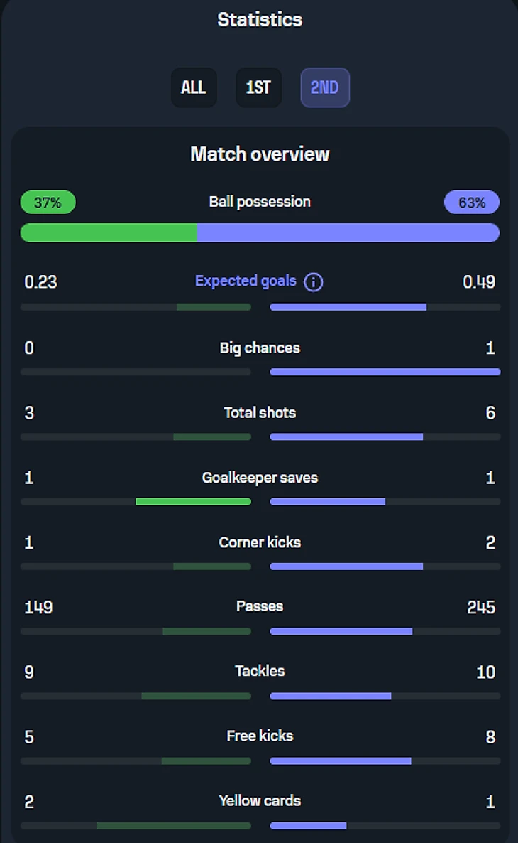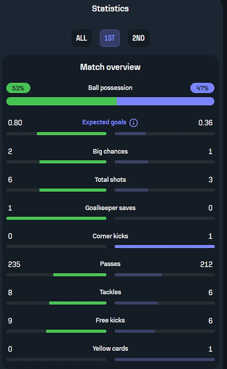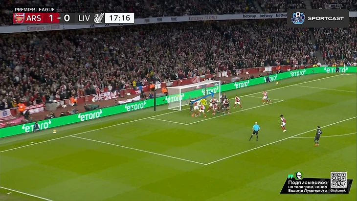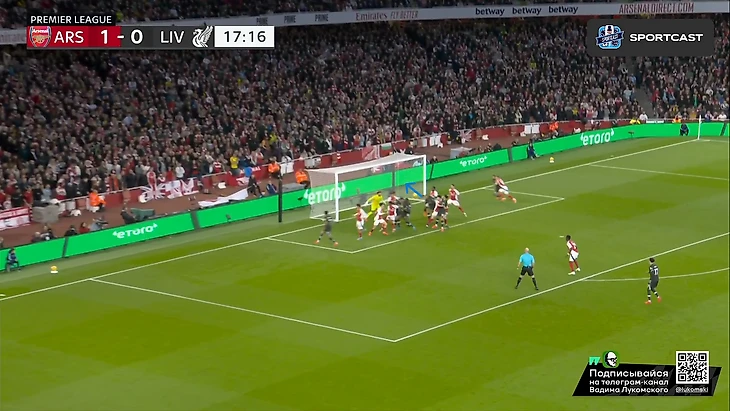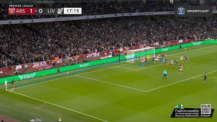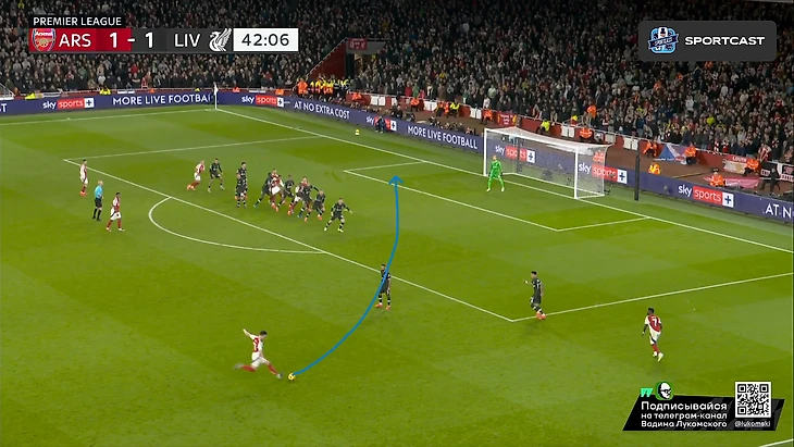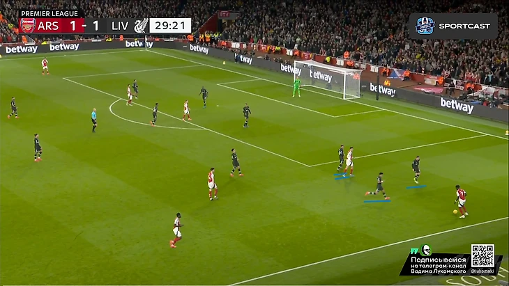 2 человека: Диас и Робертсон (подчеркнуты 1 чертой) ответственны исключительно за эту зону, а Мак Аллистер (подчеркнут 2 чертами), пусть и отвечает персонально за Хаверца, но также может подстраховать и в случае прорыва Саки. И в результате этого действа, вплоть до конца тайма, а ситуативно и вообще до финального свистка, Букайо приходилось исключительно фонтанировать передачами назад, а не обострять, т.к рисковать в данной ситуации было просто бессмысленно, ибо шансы на прорыв если не нулевые, то околонулевые точно. А вот концовка тайма, несмотря на все усилия «мерсисайдцйев» всячески засушить эту игру, получилась для них крайне нелицеприятной: гол Мерино со стандарта вновь вывел хозяев вперед: