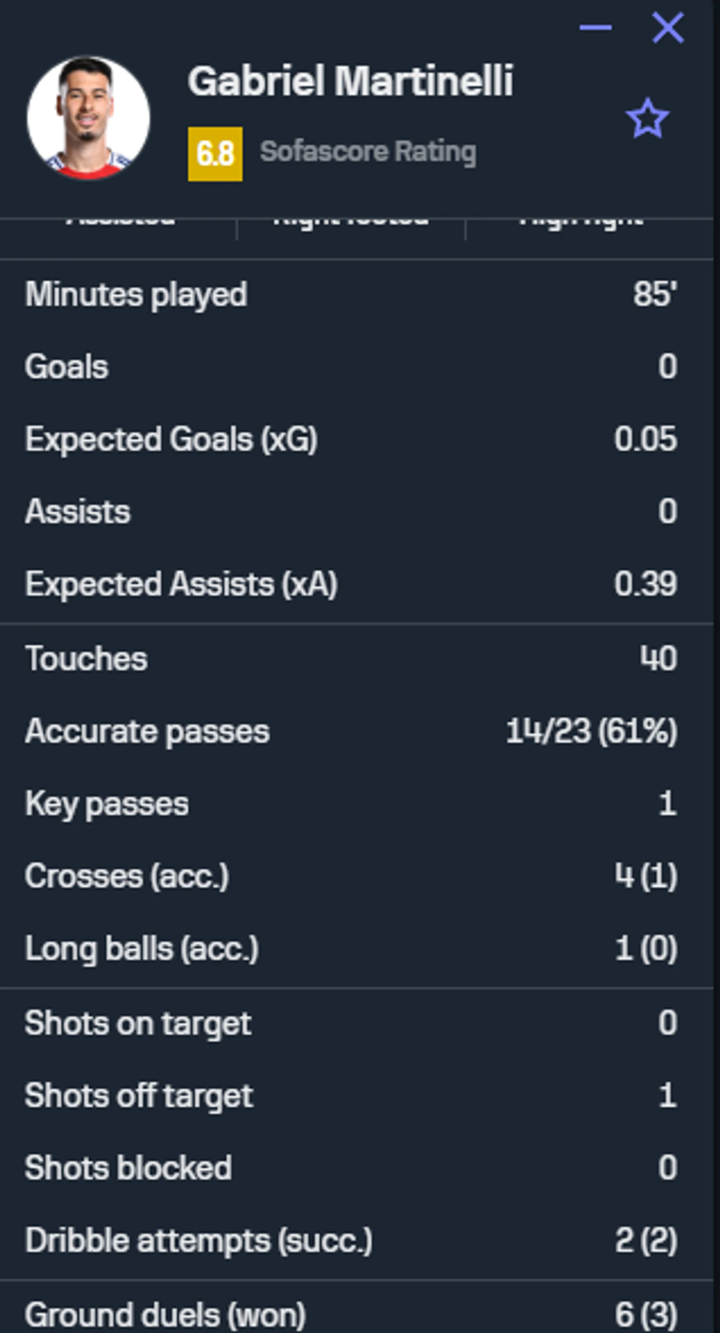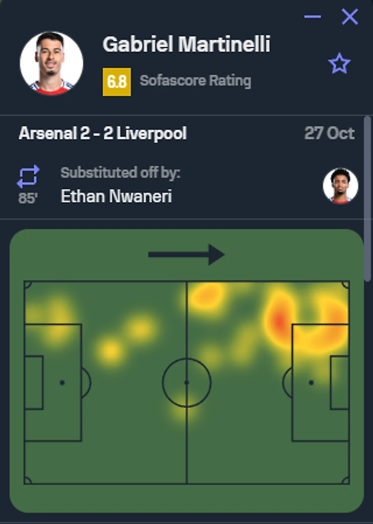 Тут же, как по мне, никакие оценки и тепловые карты, несмотря на то, что я их таки поставил, правда лишь ради общего представления о Габриэле сегодня, не передадут в полной мере тот объем работы, который Мартинелли проделал в этой игре. Однако, в первой половине он зачастую просто стоял на своем фланге абсолютно без дела и без мяча, казался отрешенным, но все дело лишь в том, что как только «канониры» нащупали мнимое слабое место в обороне соперника слева, на правый фланг мяч практически перестал доходить вплоть до конца тайма, и вины самого бразильца здесь ровно 0% Когда же во второй половине он стал фактическим латералем при обороне, подстраховывая всех и вся, т.к тот, кто мог и страховал левого защитника Тимбера – Габриэл Магальяэс, покинул поле, а вышедшему вместо него Киверу самому зачастую требовалась подстраховка, особенно при дуэлях с Салахом. И получилось так, что Мартинели и с Салахом на рандеву нередко оставался: