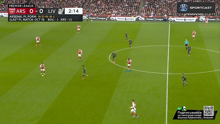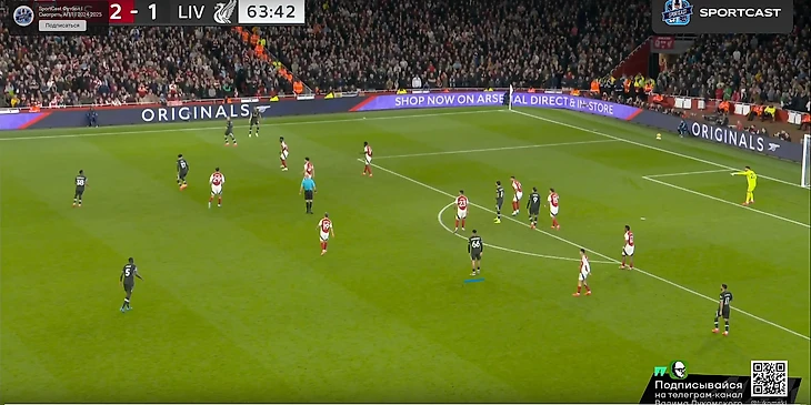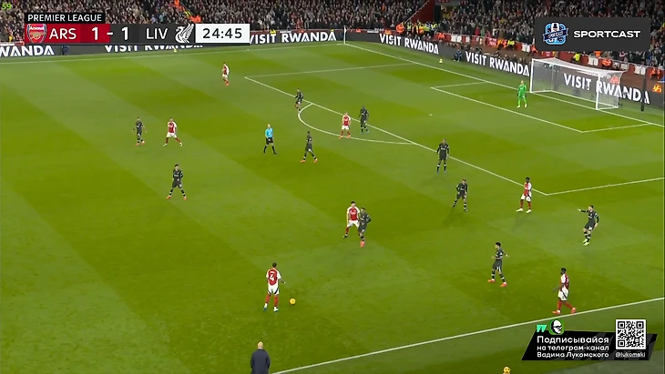 Столь подробно разбирать этот гол смыла особого не вижу, т.к лично по моему, крайне дилетантскому взгляду, произошедшее здесь – заслуга исключительно подающей команды, и вины обороны здесь по минимуму. Да, Диаса действительно упустили опекавшие его Мартинелли и Хаверц, но на угловых упустить человека ростом метр с кепкой – дело весьма обычное, ведь оборона все же больше концентрируется на таких верзилах, как ван Дейк, а на условных Диасах сосредоточения внимания идет куда меньше. Тем не менее, и главную мерсисайдскую верзилу «канонирам» сдержать не удалось, и вот это в какой-то степени все же можно занести в ошибку хозяев, но здесь вновь все упирается в банальный недостаток рослых игроков у «Арсенала», который в атаке удается компенсировать феноменальными тактиками розыгрышей, однако в обороне все отталкивается от соперника, и там уже куда сложнее. Так еще и Салибы сегодня не было, что еще больше усугубило ситуацию со средним ростом. И еще по хронологии (последний раз в тайме): дальше «Ливерпуль» практически сразу решил на свои собственные грабли не наступать и конкретно так присесть в средне-низкий блок по всем конспектам Артеты, который сегодня, видимо, их выкинул и играл абсолютно по-другому пока позволяла ситуация, а Арне Слот их благополучно подобрал и интерпретировал на этот матч. Посмотрите сами: Анонсированный выше средне-низкий блок, помимо просто своего присутствия в игре «Ливерпуля», кажется, впервые лет эдак за 10 (со времен прихода Клоппа), имела еще одну, более вопиющею деталь: практически полный отказ от прессинга: