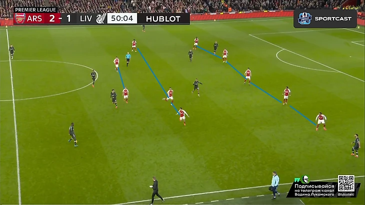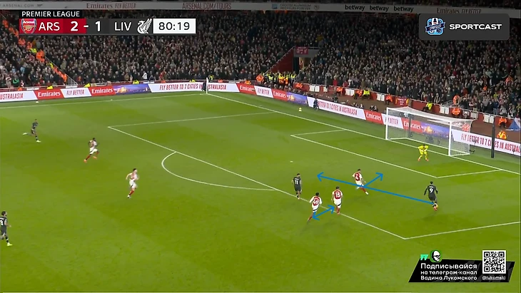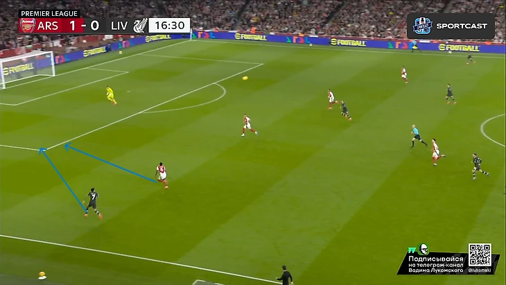 Так и в атаку был вынужден бегать чуть ли не в одиночку, т.к после провальной идеи пихать лишь на право, Артета таки додумался пытаться наказывать «Ливерпуль» за столь высокого Трента (подчеркнут чертой на скрине снизу), который в оборону, зачастую, вообще не возвращался: