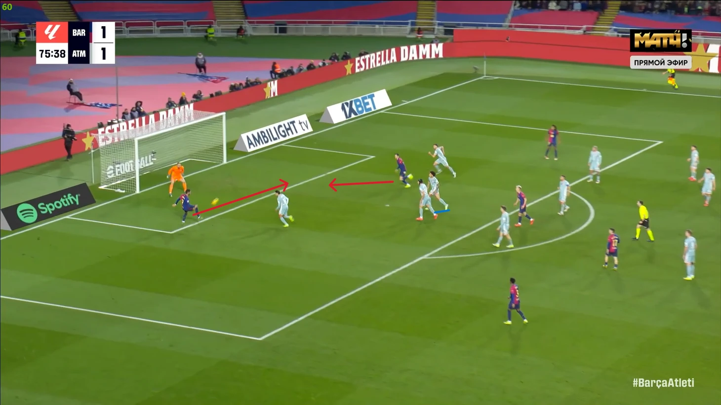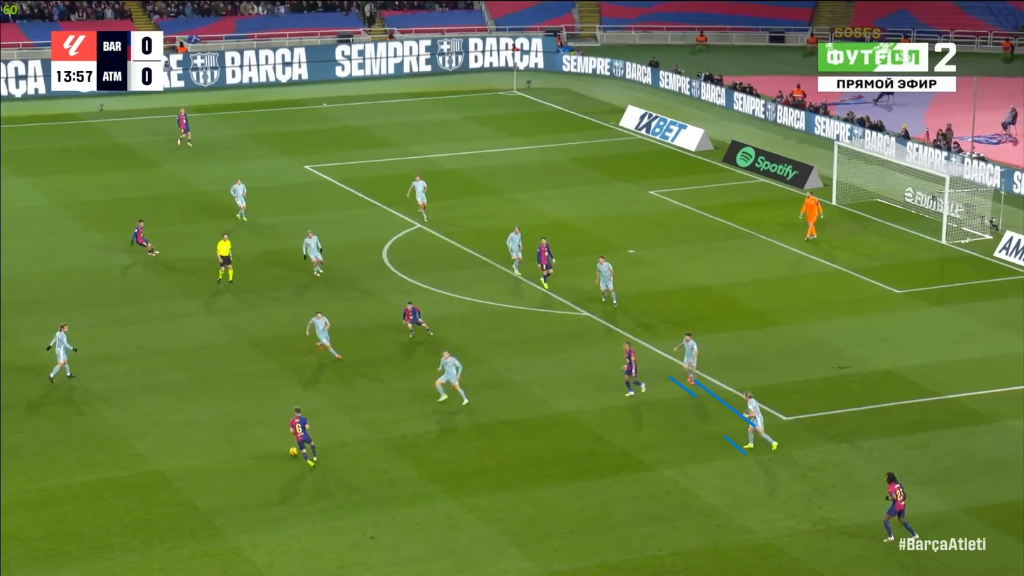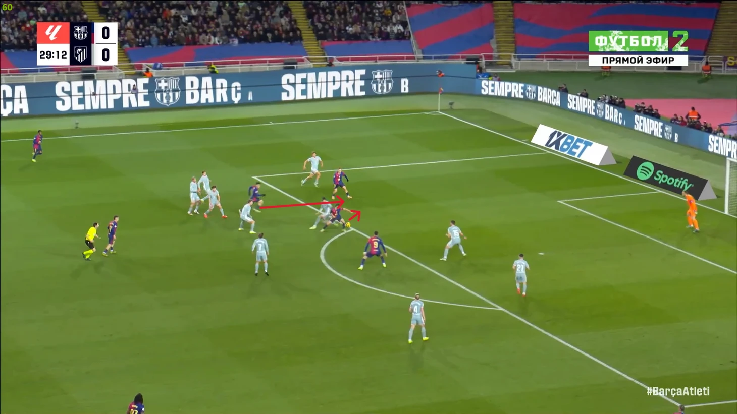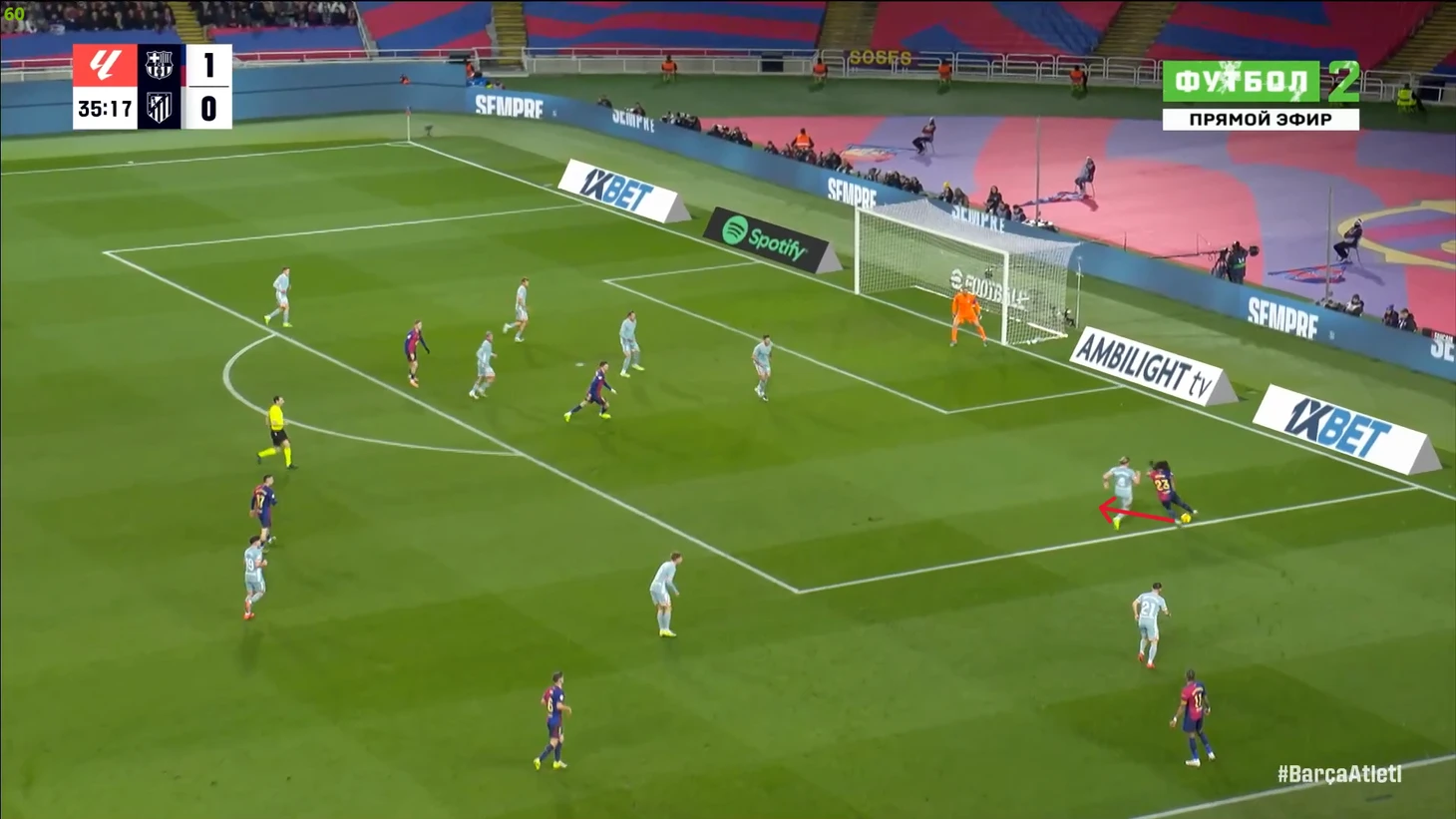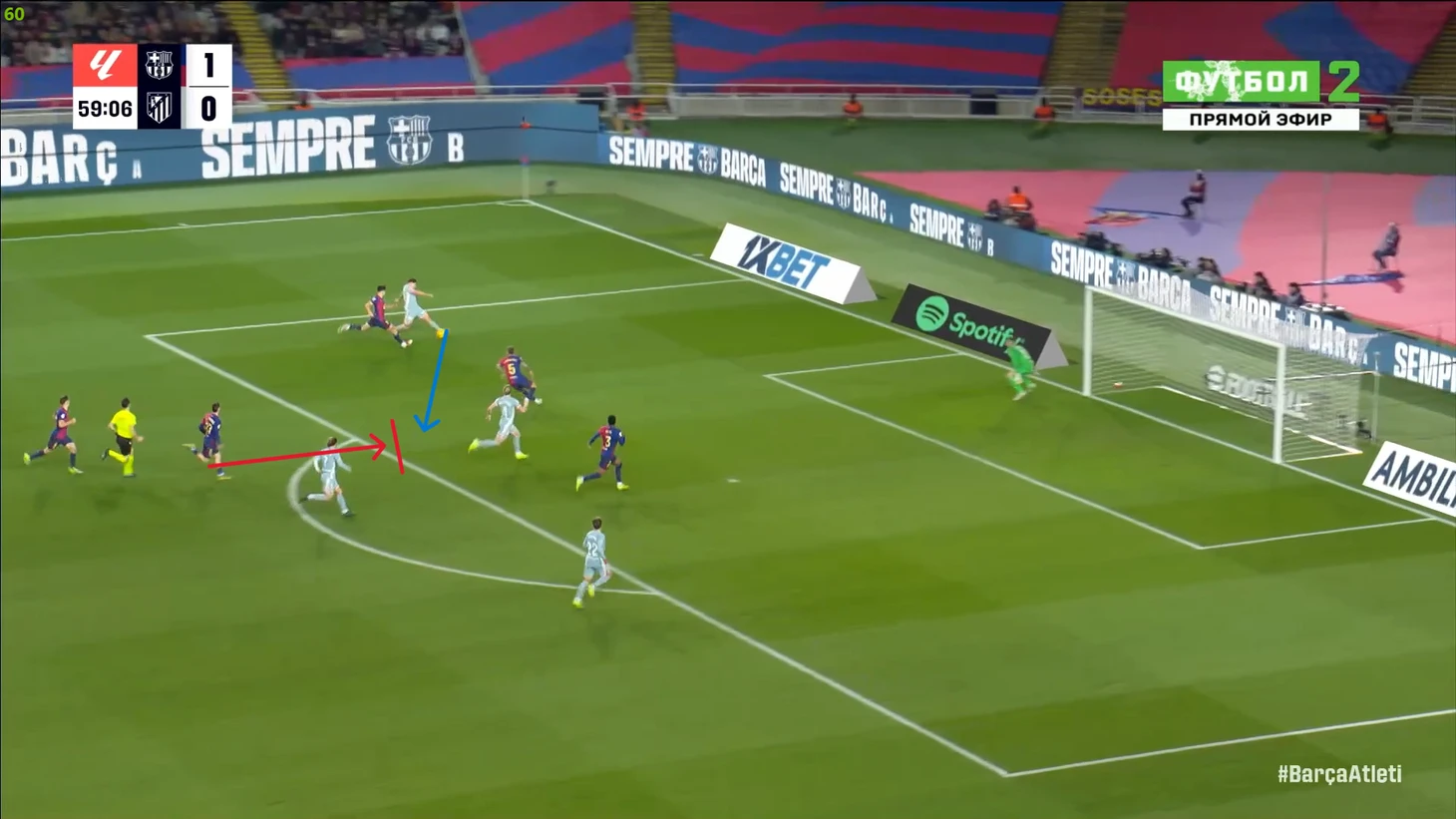 Тем не менее, «Барса» продолжала ловить «Атлетико» на контратаках. Команду которая вообще не атаковала (как и говорил Симеоне на пресс-конференции), они умудрялись ловить на контратаках, фантастика просто! И опять же, все это через фланг Рафиньи. Вот самый показательный момент в этом плане: