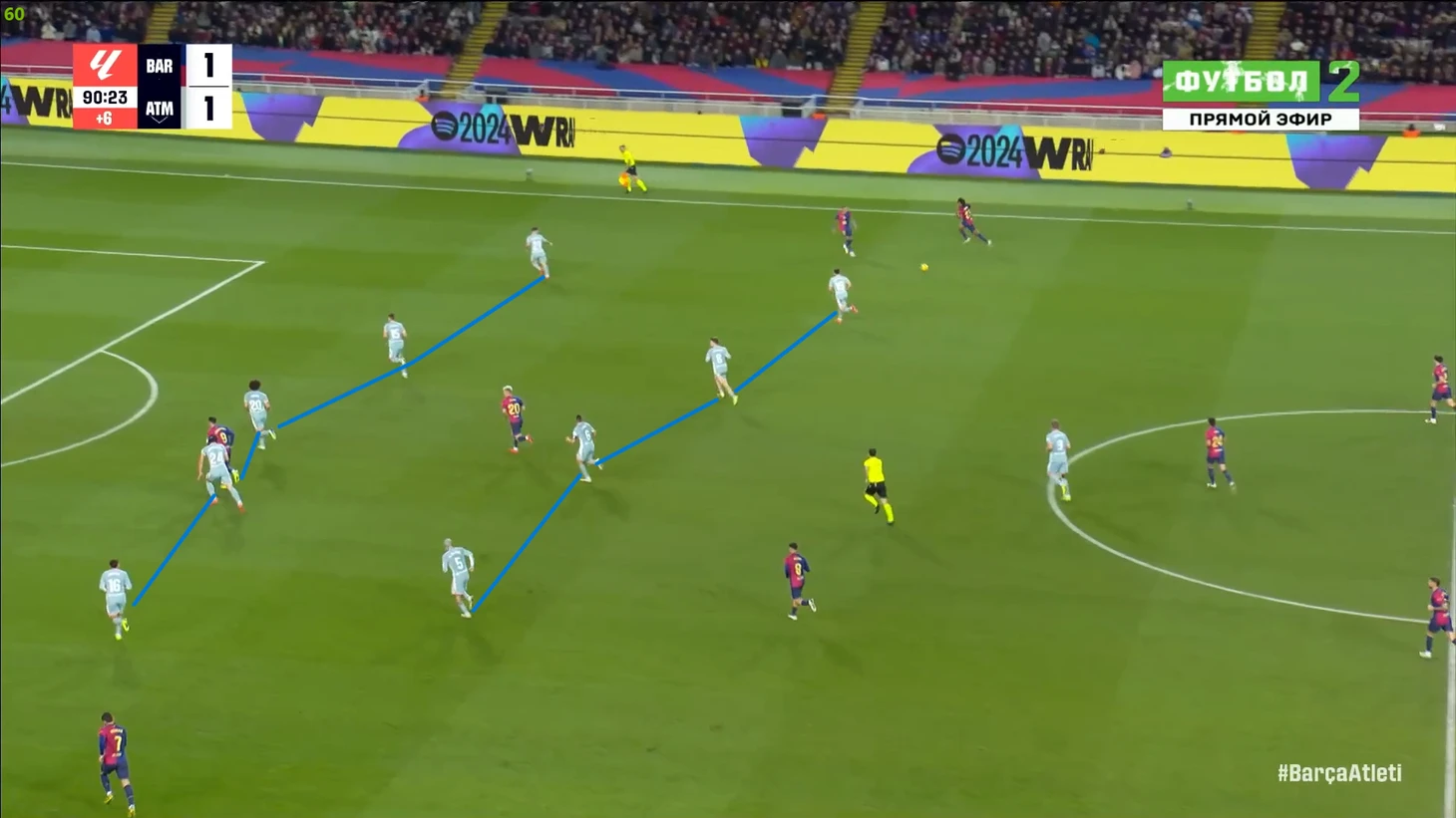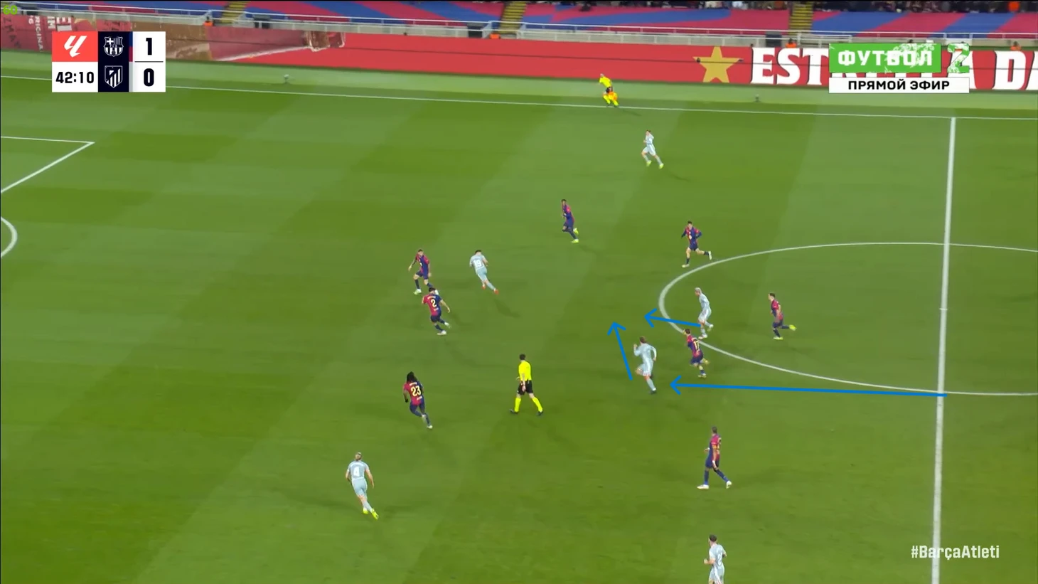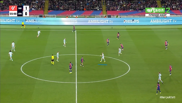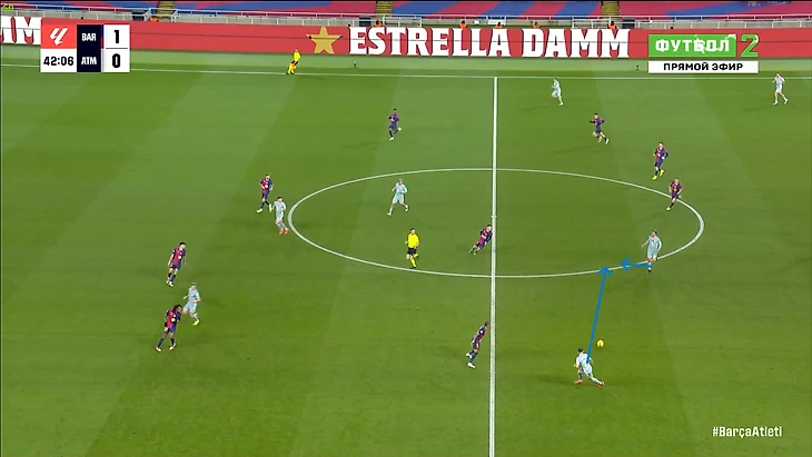 Кстати давайте же вместе угадаем: кто разогнал голевую атаку «Атлетико»? Ну ладно, вопрос риторический, конечно Гризманн. «Барселону» в этом моменте даже критиковать особо не за что. Да, пропустили достаточно простую контратаку, и оставили слишком мало человек в обороне (Кубарси вообще непонятно где был), но ведь это и есть стиль Флика. Но все же одна очевидная ошибка игрока «каталонцев» тут есть – выбор позиции Иньяки Пеньи, который вновь прижался к ближней штанге. Сколько раз уже у Иньяки были точно такие же ошибки, но тренерский штаб и сам Пенья этого будто не замечают. И да, я напомню, что Щенсный по-прежнему не дебютировал за «Барселону». В результате у Пеньи даже теоретических шансов достать этот мяч не было. После пропущенного «матрасники» вновь предприняли попытку сесть в крайне глубокие 5-3-2, и Симеоне сделал замены под это уже через 2 минуты после гола: вместо Джулиано вышел Молина и стал третьем центральным, а вместо Галлахера вышел Коке и окончательно загубил атакующий потенциал гостей в центре поля (если не считать регулярно опускающегося туда Гризманна). В результате «Атлетико» стал выглядеть вот так: