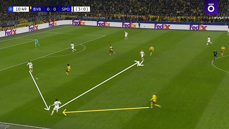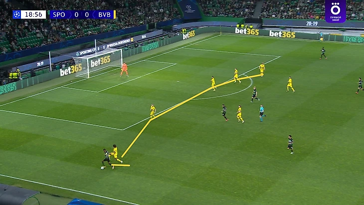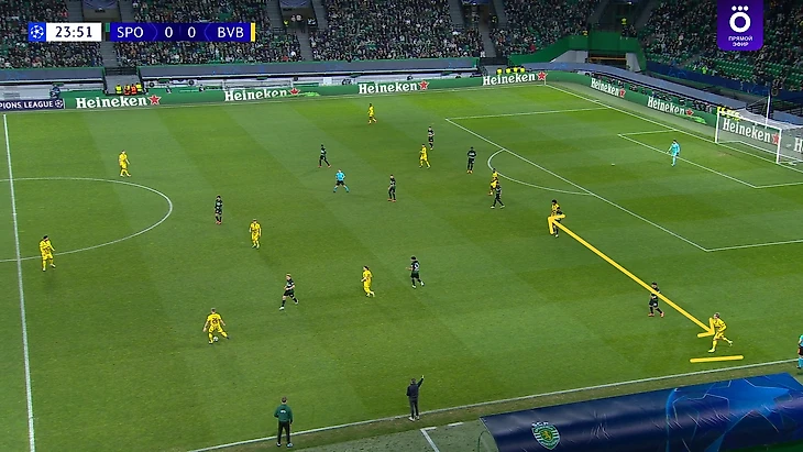 В какой-то момент «Спортинг» понял, что проходить Даниэля – это задача не особо сложная, и из этого вполне можно извлекать неплохие атаки на пространстве, если быстро комбинировать и доводить мяч до Харбера или Кенда, тем более правый фланг изначально приоритетный для португальцев (37% атак шло через него). В результате не раз и не два получались подобные ситуации: