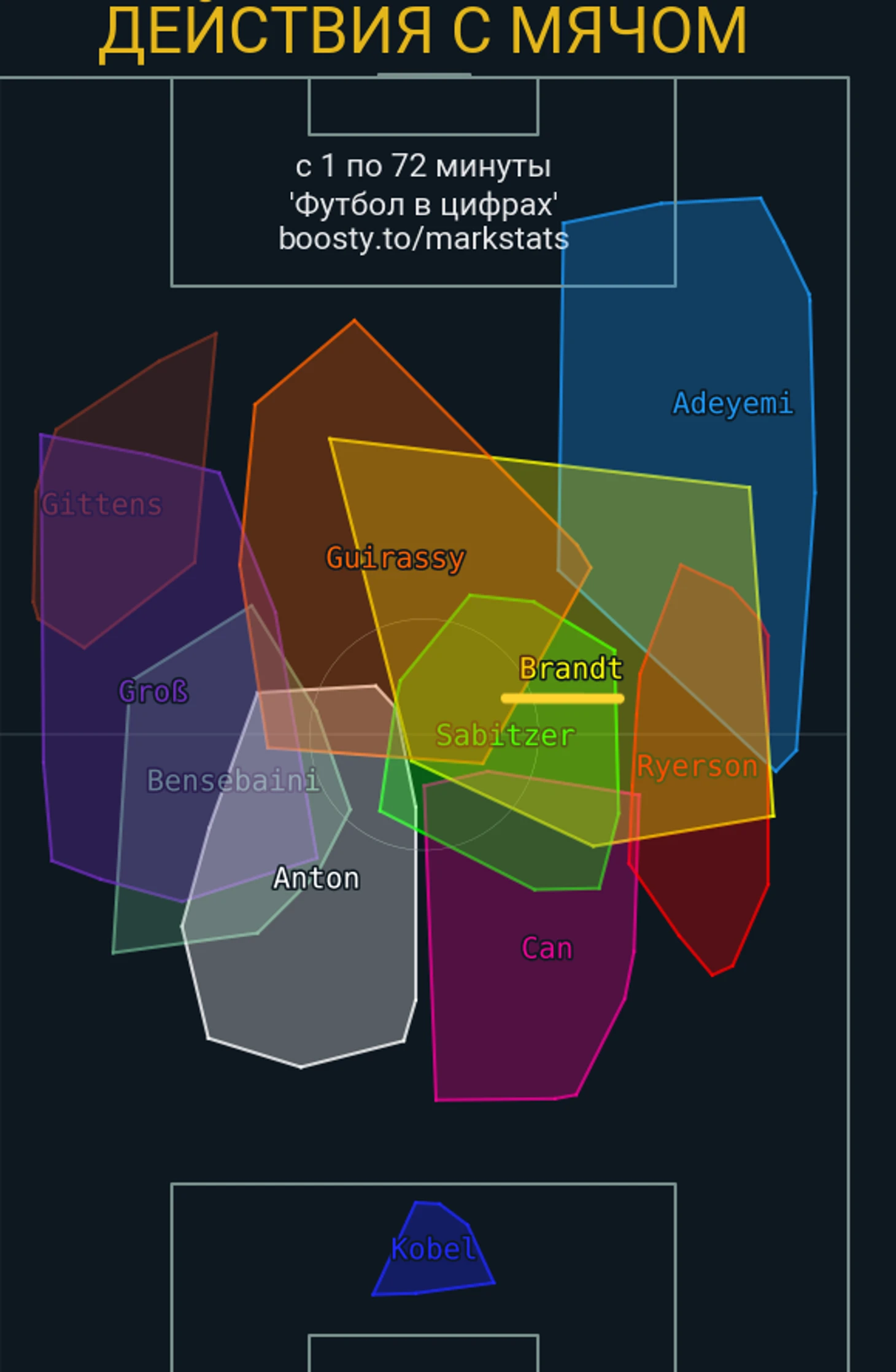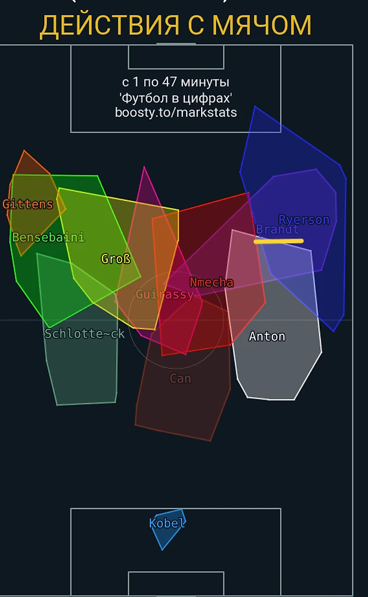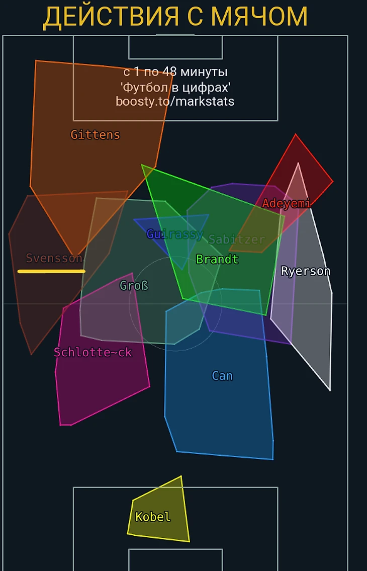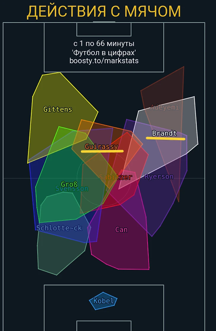 Помимо позиции Свенссона, тут обращу ваше внимание еще на Шлоттербека, расположение которого на этой карте подкрепляет тезис выше, Джана (это нам понадобится в разборах следующих матчей) и Брандта, о котором сейчас речь и пойдет.