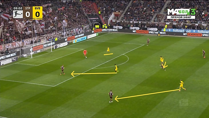 Вкупе эти 2 вышеописанных пункта снова дали «Дортмунду» внушительную эффективность прессинга, особенно на площади 60% поля, ведь практически всегда игроки «Санкт-Паули» предпочитали не рисковать и выбить мяч подальше, чем за те же 40%, где уже теряли мяч в борьбе.