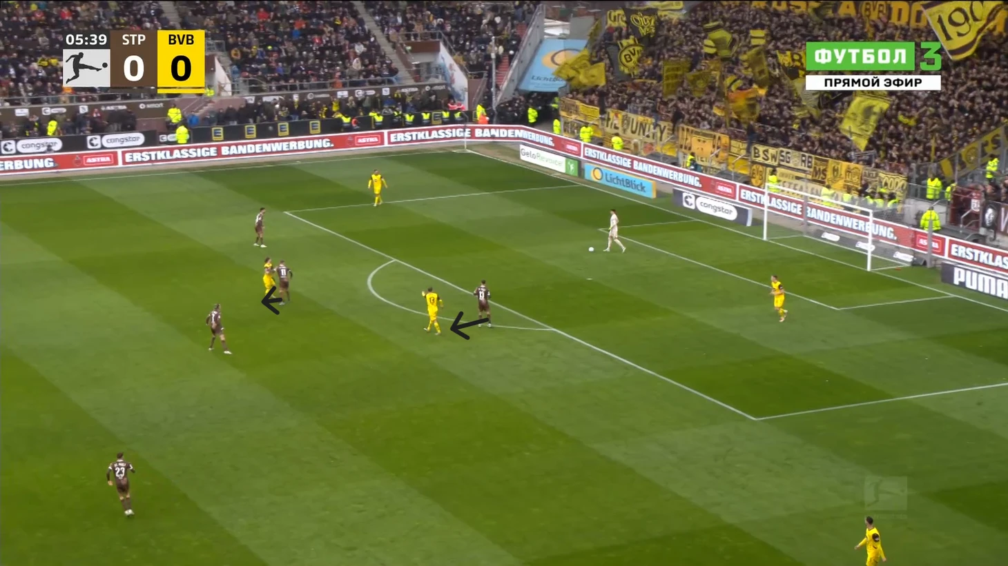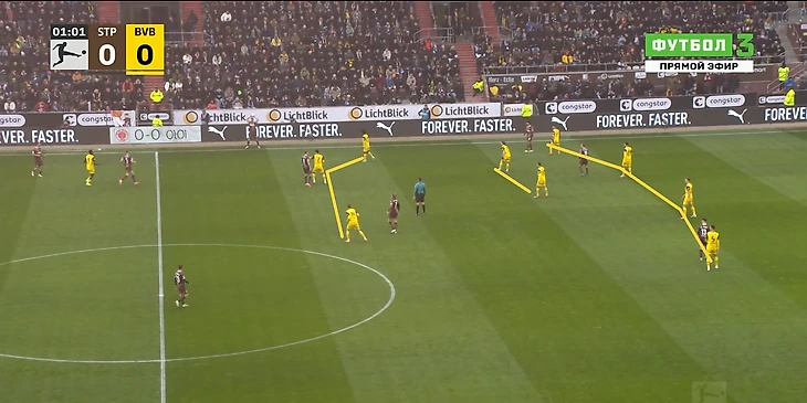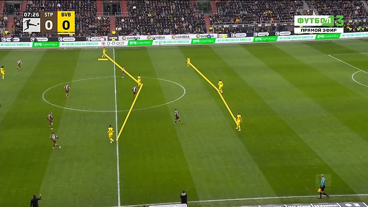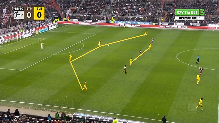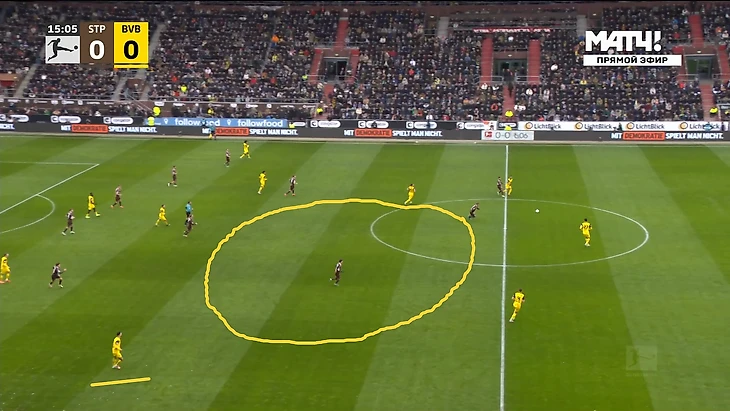 Однако одно существенное отличие от «Бохума» все же было – игроки «Санкт-Паули» попросту садились ниже ближе к центру поля, и таких прессинг-ловушек, как один из предыдущих соперников «Дортмунда» не организовывали, ограничась персональной установкой в высокой позиции.