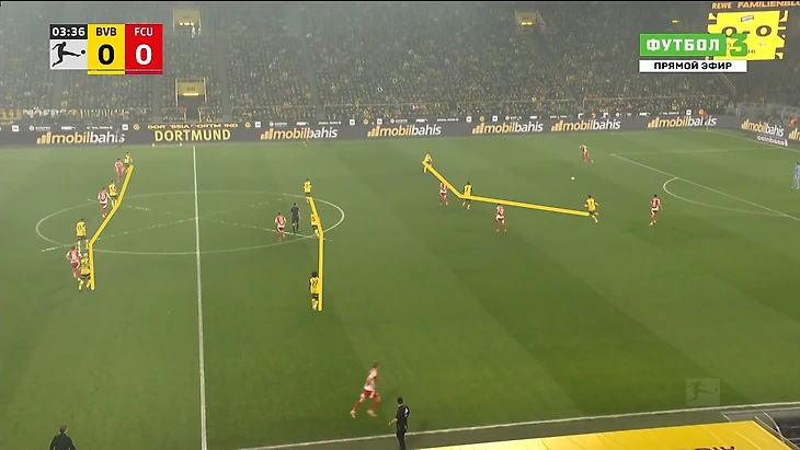 Как можно увидеть здесь, Нико в своем дебюте сразу решил усовершенствовать идеи Шахина и еще больше инвертировать Бенсебайни в билд-апе. Причем настолько, что Гросс теперь играл практически на уровне с Брандтом, ведь в центре ему места банально не нашлось.