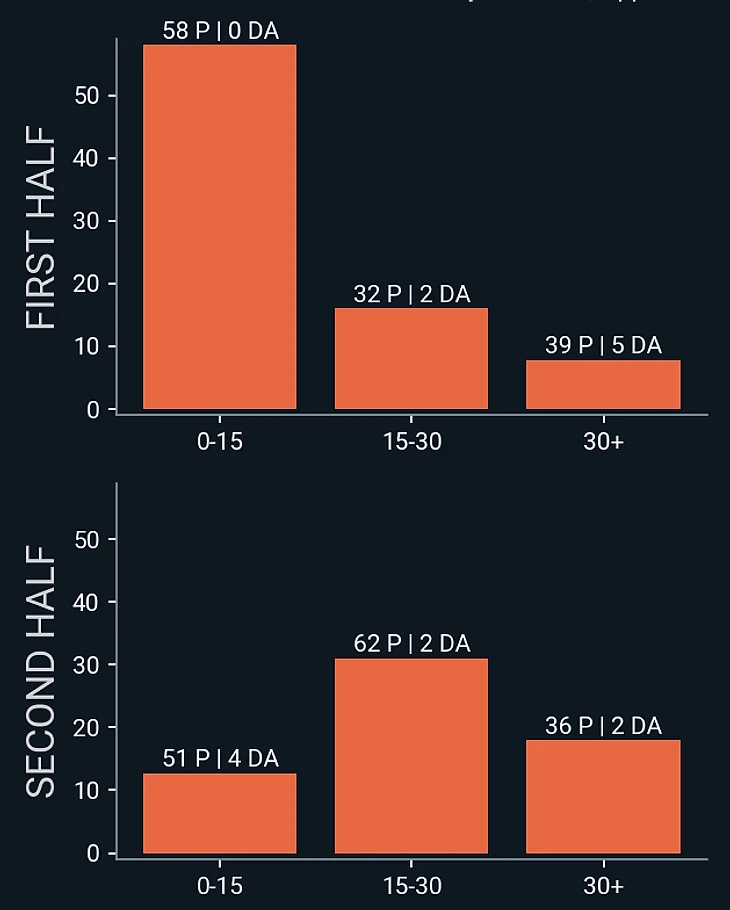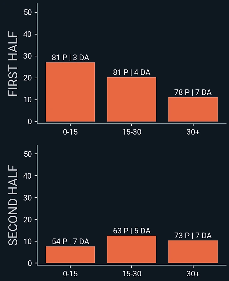 Вновь очень невзрачное начало в плане давления: в первые 15 минут допустили в этой зоне 58 пасов и совершили 0 оборонительных действий. Уже какая-то закономерность с плохим началом игр.