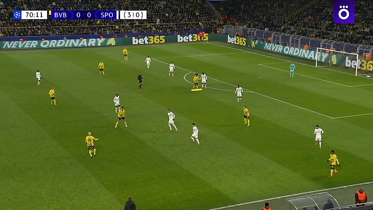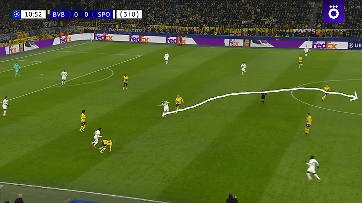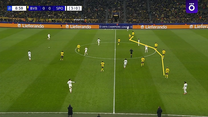 В отличие от своего дебюта со «Спортингом», здесь Карни занял позицию справа на краю атаки без мяча, а на мяче больше тяготел к центру. Таким образом, «Боруссия» на последние 20 минут изменила схему без мяча на 4-2-3-1: