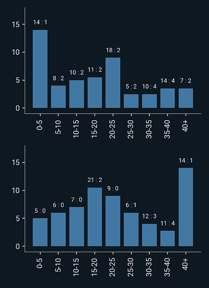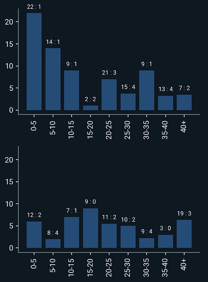 PPDA60 «Боруссии» в матче со «Спортингом». Верхние столбцы – первый тайм, нижние – второй