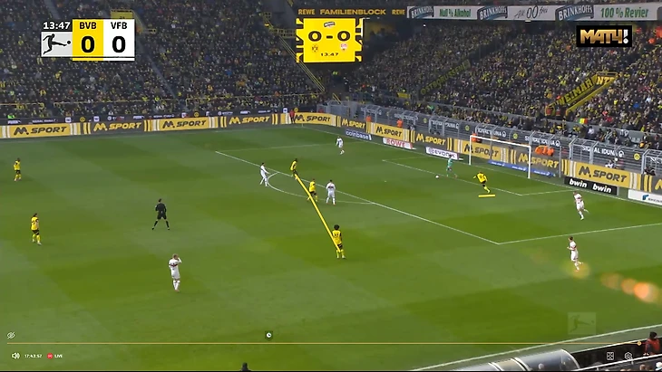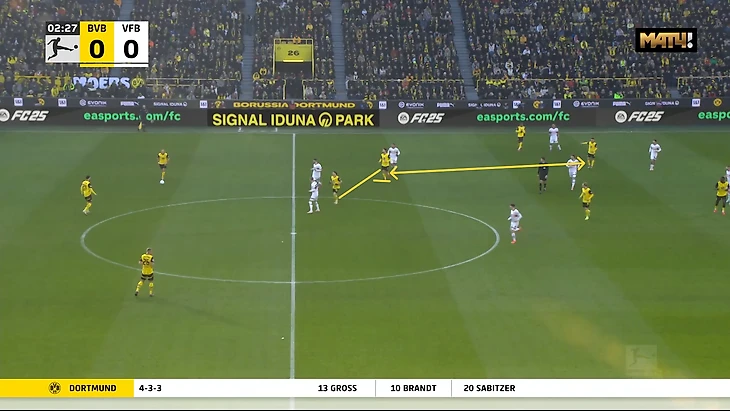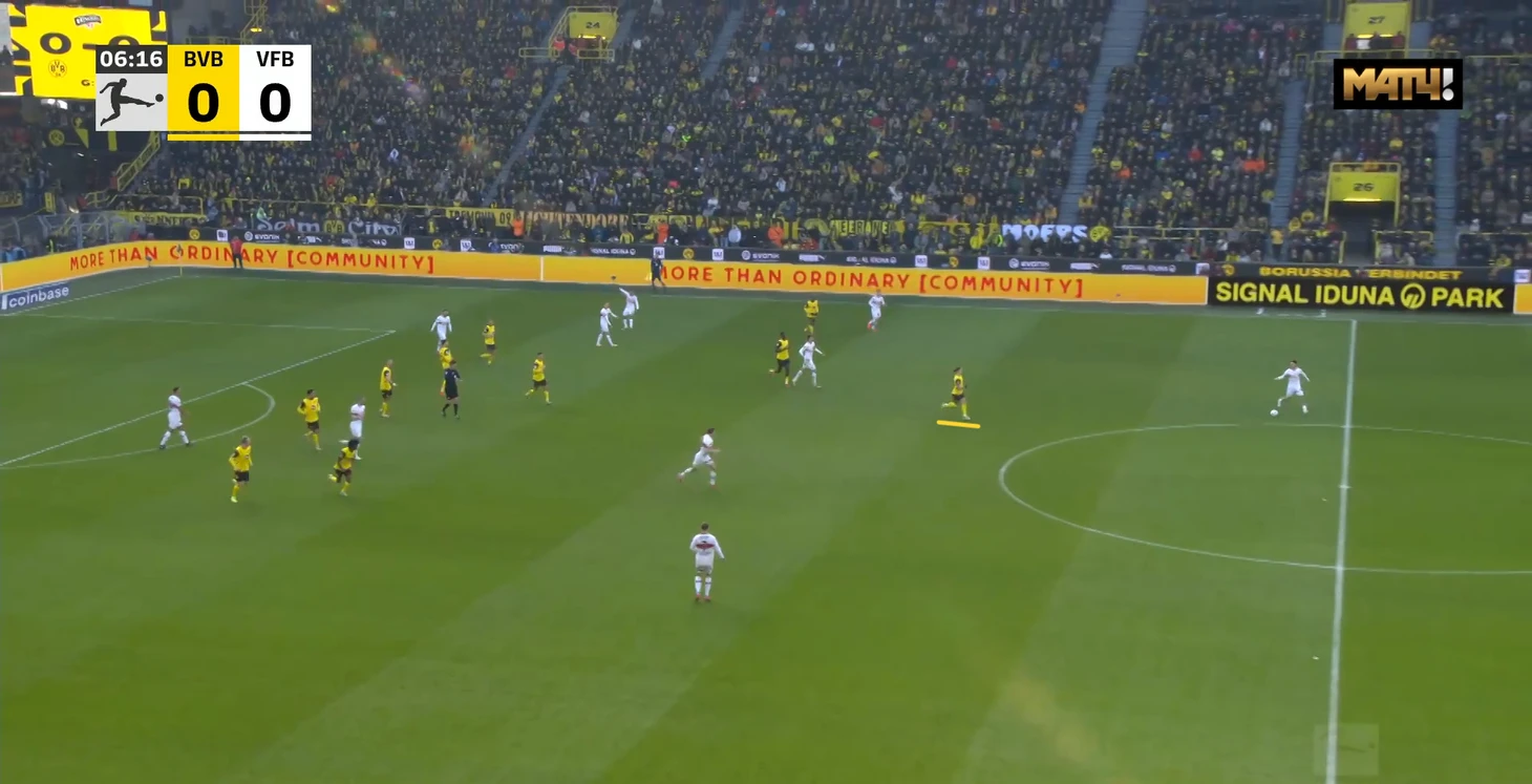 Подобная ситуация возникала едва ли не в каждой позиционной атаки «Дортмунда» в первом тайме, в случае, если Паскаль Гросс позволял себе уходить из опорной зоны в более высокую позицию, хотя у него в принципе функционал кардинально отличается от того же Забитцера, который в этой зоне в некоторых матчах по все 90 минут чалился.