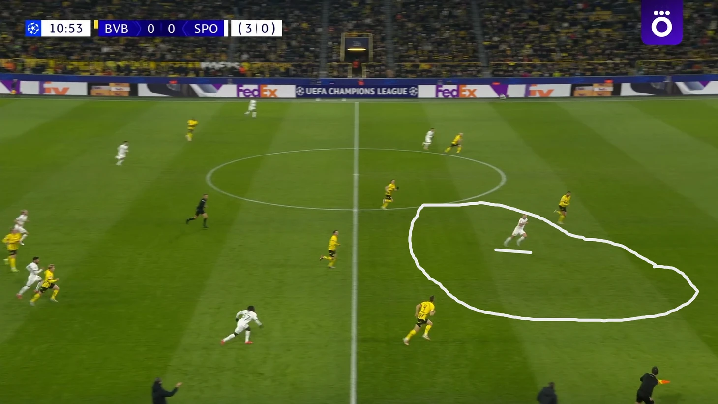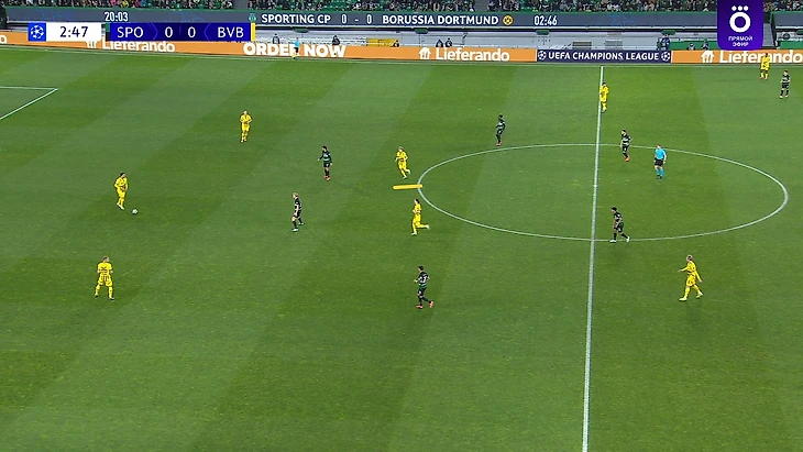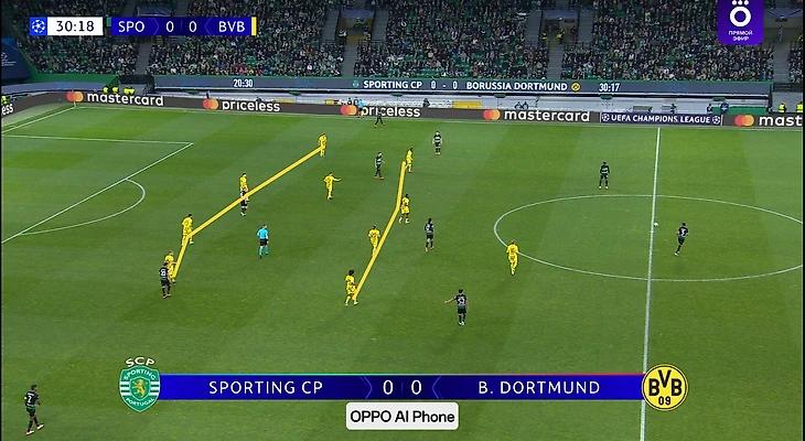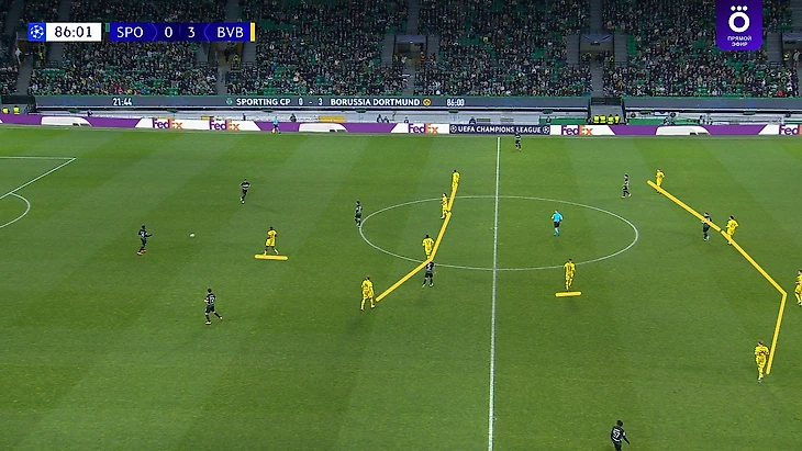 Этой перестановки, которая была вообще не эпизодической, я не понял совсем, ведь «Спортинг» очень любит атаковать флангами, и в этой игре через центр шло лишь 26% атак хозяев. Да даже на скрине видна ширина их широкая расстановка на мяче и вся абсурдность такой узкой обороны. Похоже на классическую упертость Шахина, хотя Ковач куда лучше умеет подстраиваться под соперников, что он докажет впоследствии