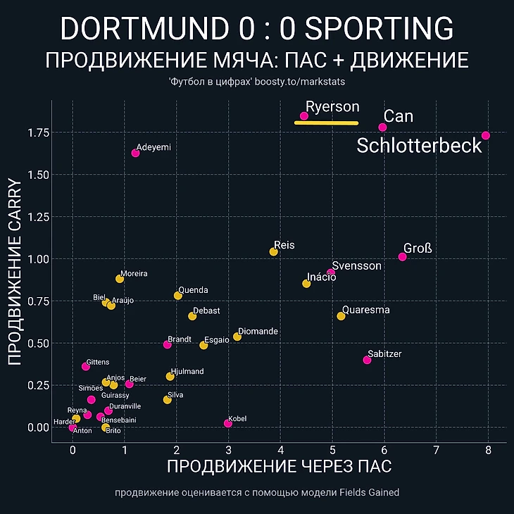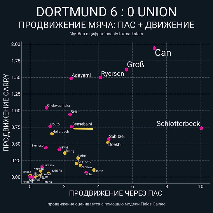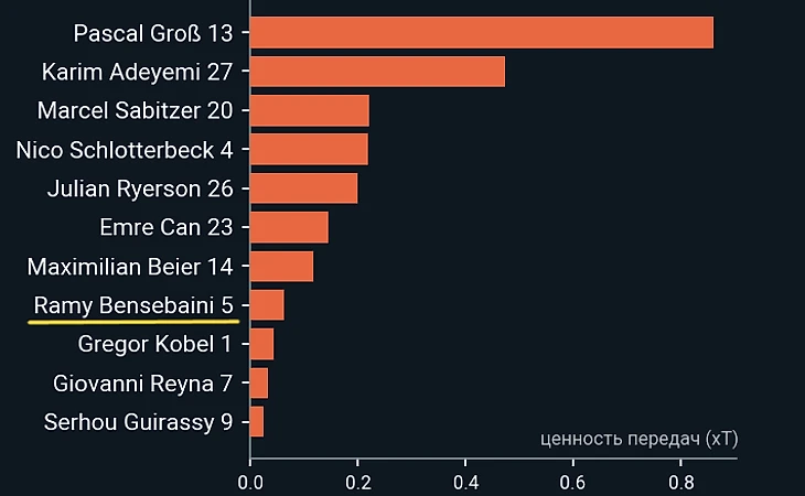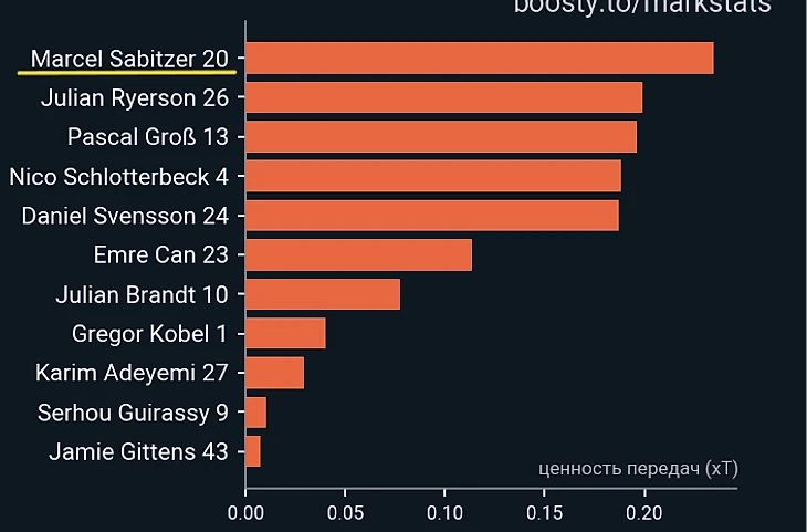 Плюс ко всему, в продвижении эти идея от главного тренера «шмелей» не особо сработала, т.к Рейна провел очередной крайне невзрачный матч, став худшим среди полевых игроков «Борусии» (включая Кобеля), что по xT, что по сумме xT c продвижением.
