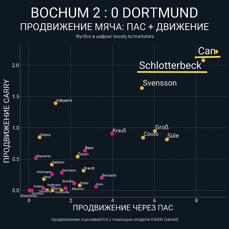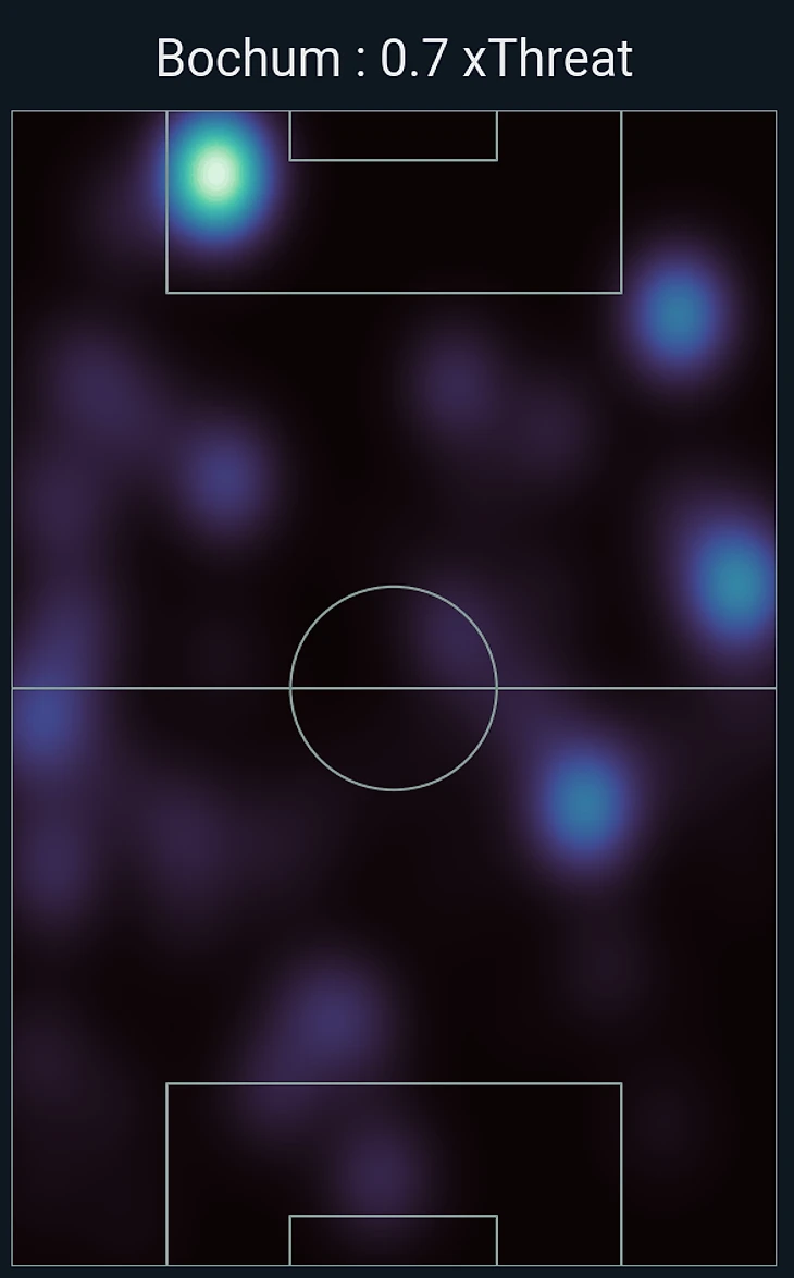 Итог этой идеи не менее смешной, чем последний пункт: по карте опасности передач (xT) примерная зона рокировок Зюле и Джана стала самой опасной зоной, из которой исходили передач «Бохума»: