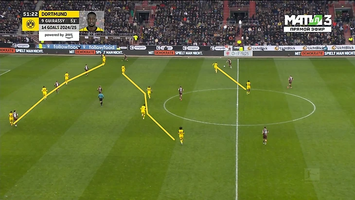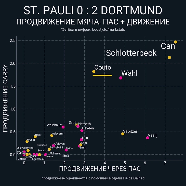 Думаю, если вы смотрели игру, то в этом тезисе у вас ровно 0 сомнений, однако все-таки докажу, что это вообще было так. Коротко, буквально одним показателем: лишь 14.2% атак «Дортмунда» доходили до финальной трети. У «Санкт-Паули» больше таковых на 6% при отставании по владению в 23% и 3% - по наклону поля: