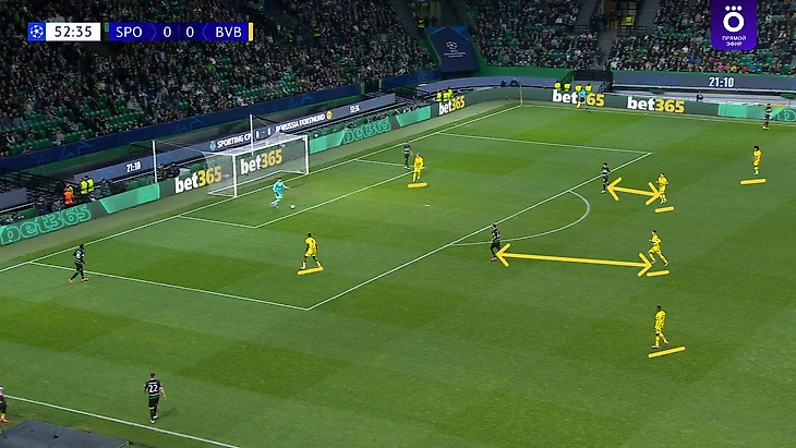 Первые глобальные изменения в игре «Боруссии», помимо вышеразобранного перехода на 4-1-4-1, произошли уже во втором тайме, причем с самого его начала: тренер вернул команду к 4-4-2 без мяча и максимально взвинтил высокий прессинг, в том числе и персональными указаниями: Гросс играл по Дебасту, а Забитцер – по Симоесу, и в принципе в высокую позицию выдвигались аж по шестеро игроков «шмелей»: