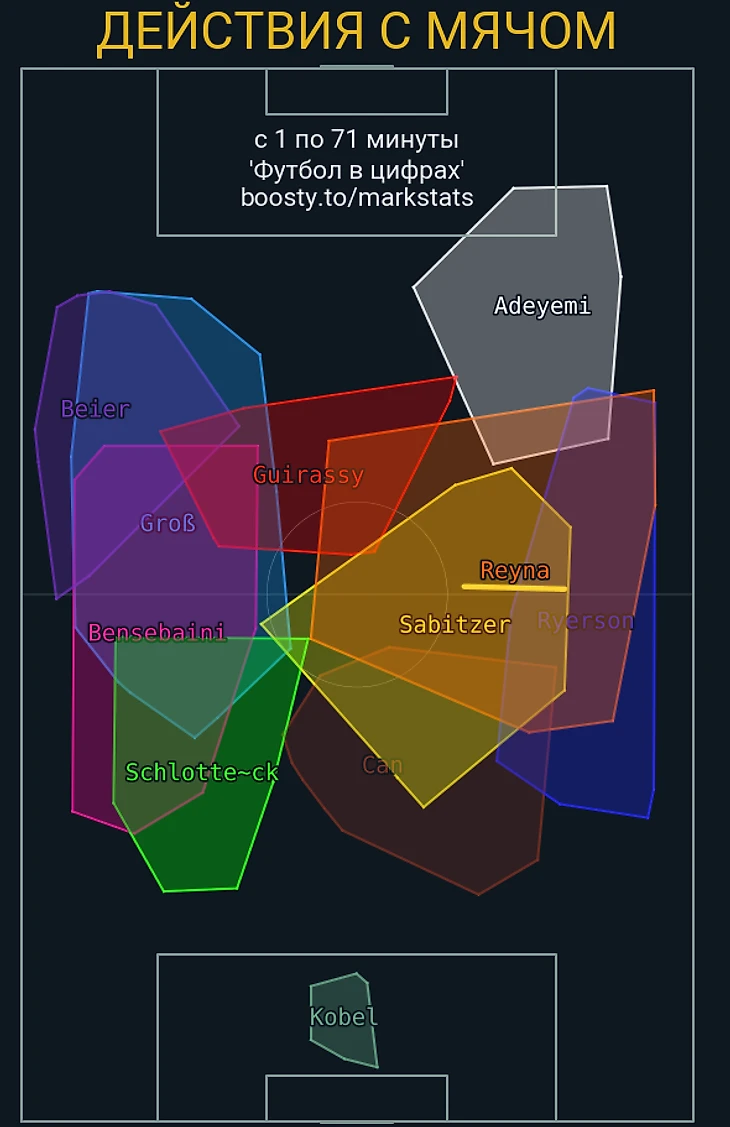 Вместе с этим, в финальных стадиях у все-таки Брандта была более определенная позиция – справа на фланге, причем немец играл даже правее Адейеми, который, в свою очередь, здесь действовал ближе к центру: