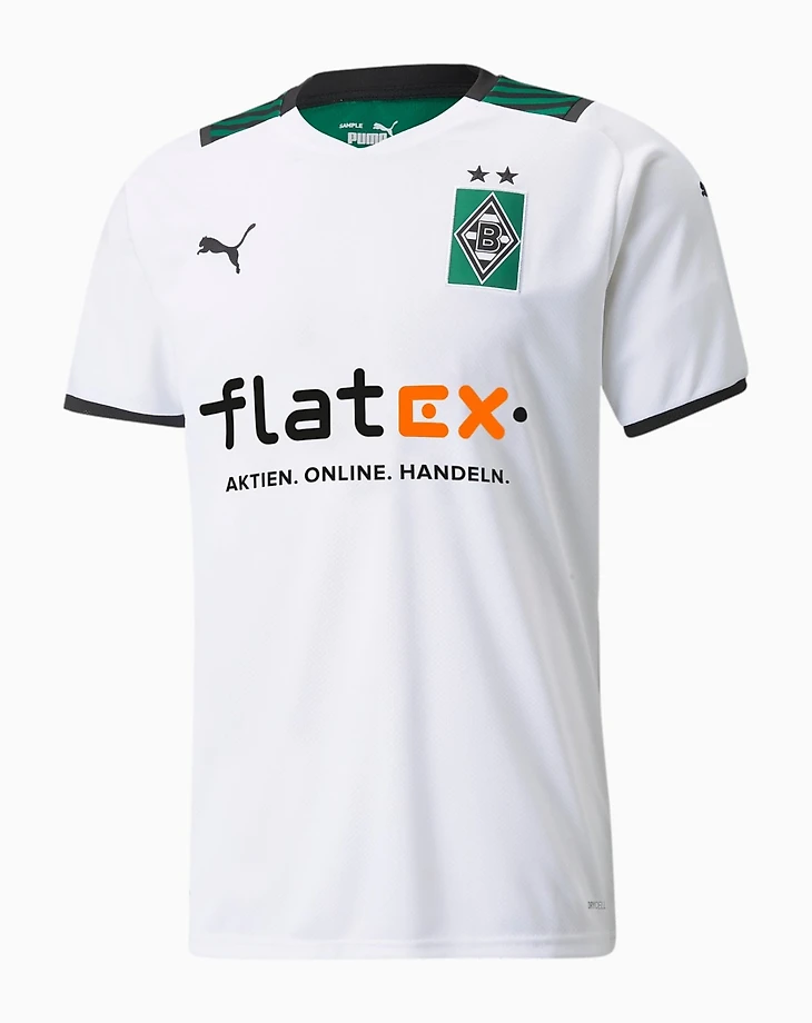 Домашний комплект сочетает в себе белую основу с черными логотипами и имеет плечевую вставку с черными и зелеными линиями.