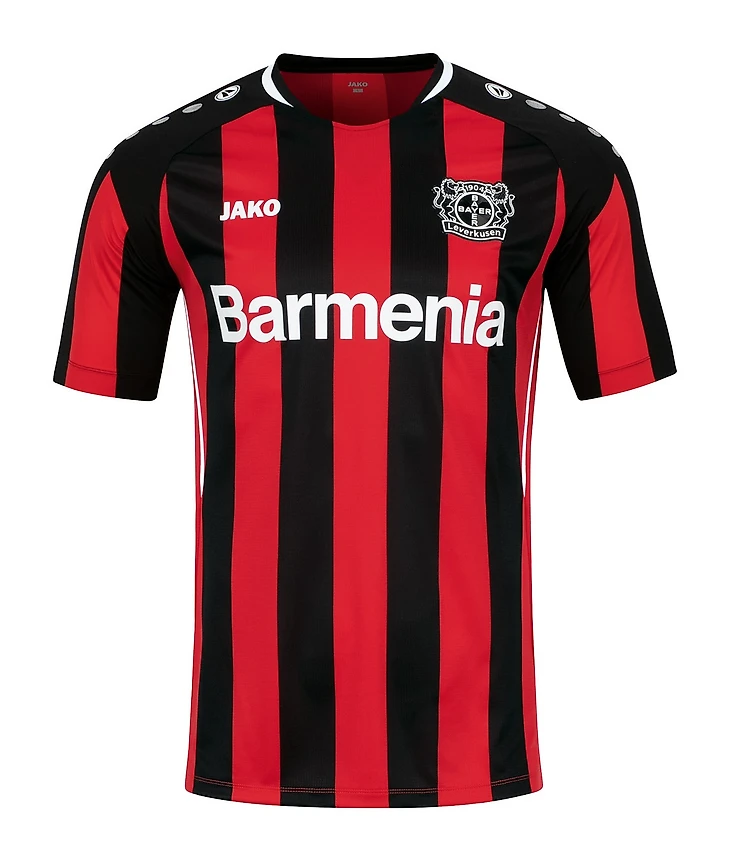 Домашний набор впервые с сезона 2005-06 выполнен в красно-черную полоску. Футболка имеет четыре черные и пять красных полос спереди и сзади, логотипы монохромно-белые. Форма вдохновлена сезоном 2001-02, в котором Байер занял 2-е место в Бундеслиге, Лиге чемпионов и DFB Pokal.