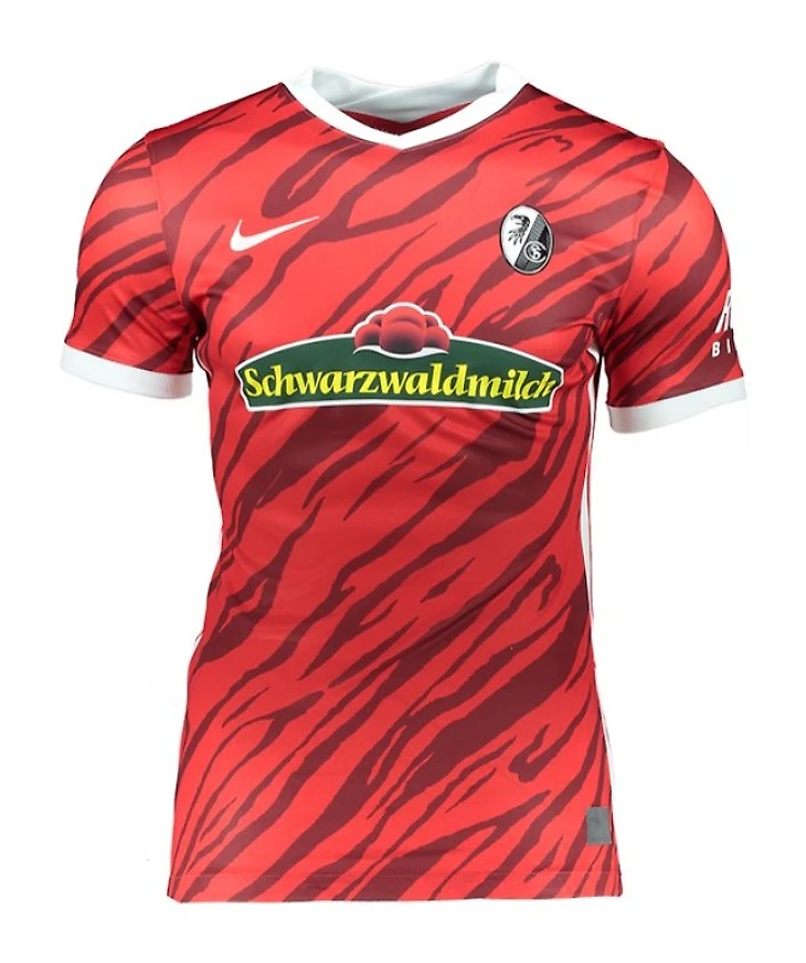 Домашняя форма выполнена в красном цвете с нанесением белого цвета на манжеты и воротник. Текстура , расположенная на всей футболке напоминает окрас хищника .