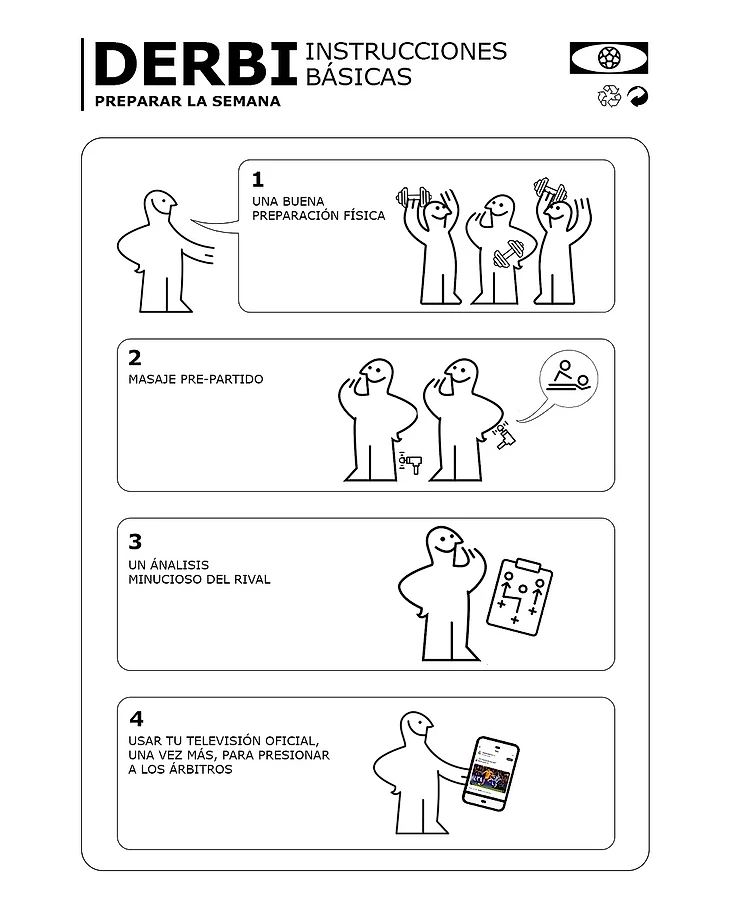 Картинка описывает, что должен сделать футболист для того, чтобы приготовиться к дерби. Перевод нижней картинки: «Еще раз использовать ваше клубное ТВ для того, чтобы давить на судей».