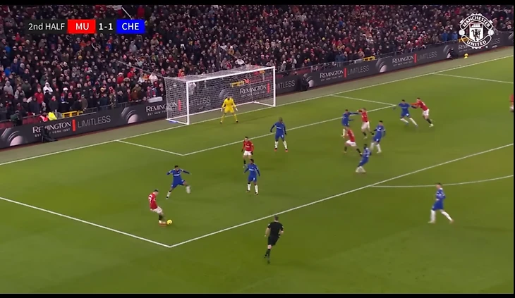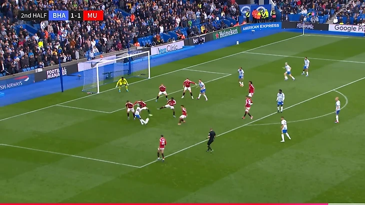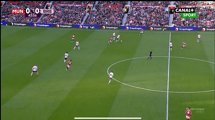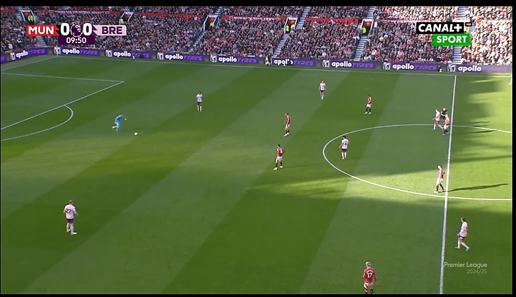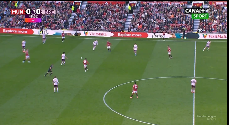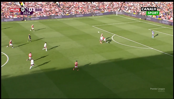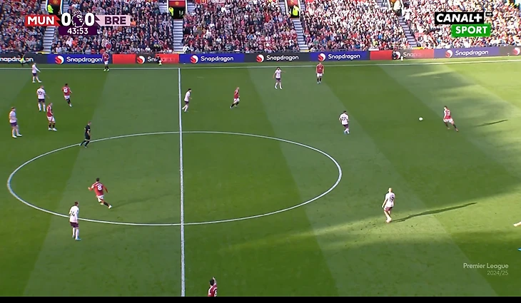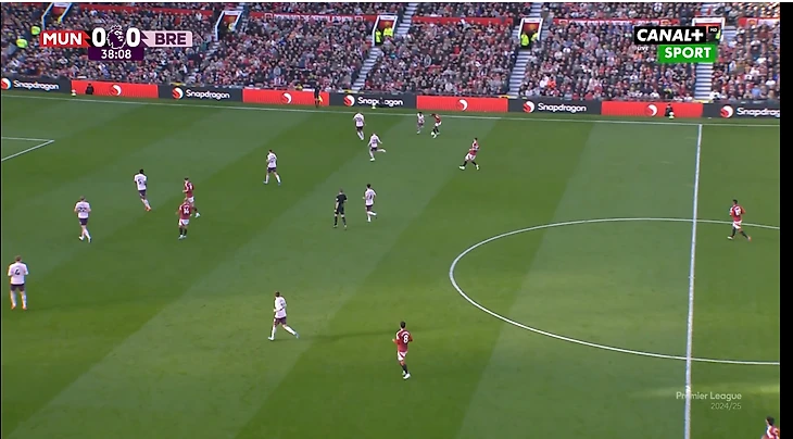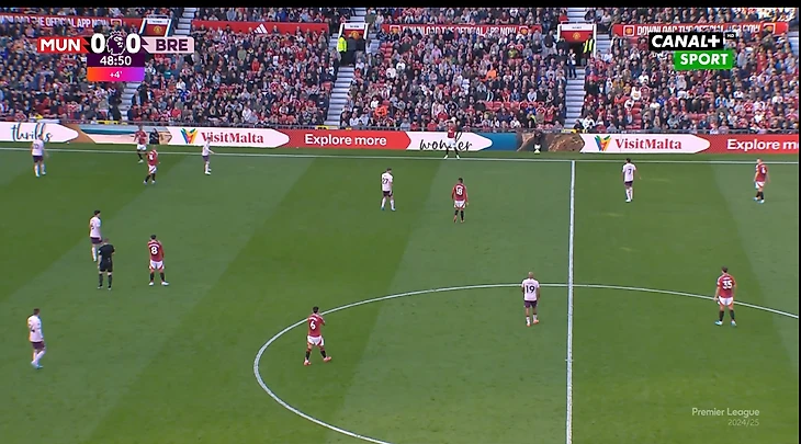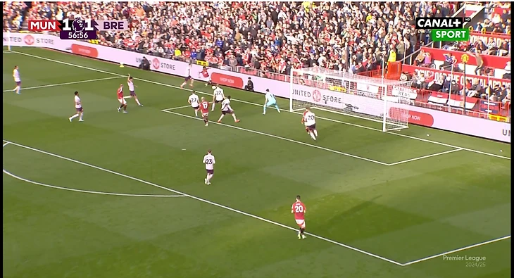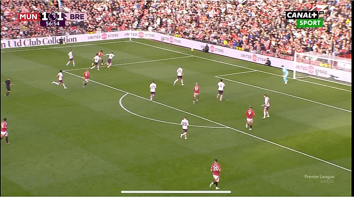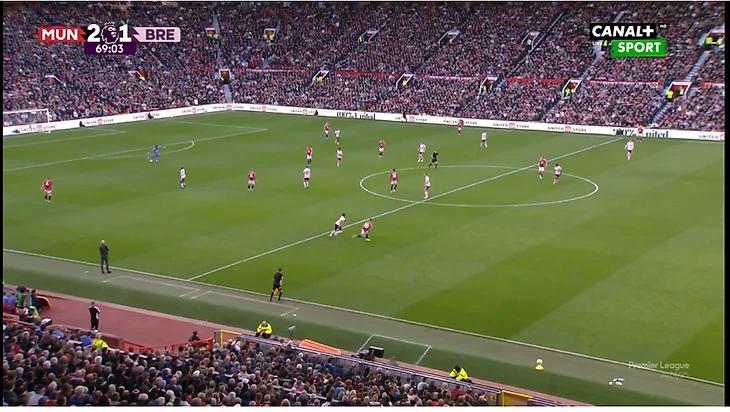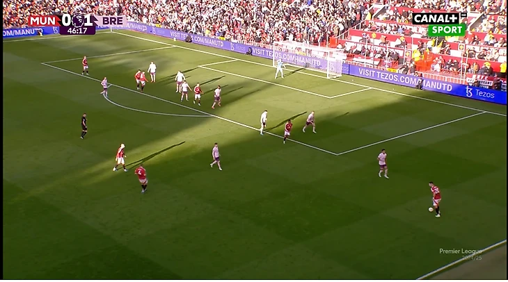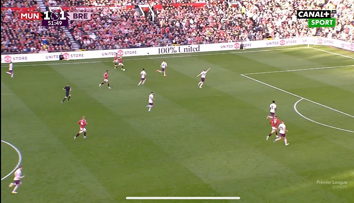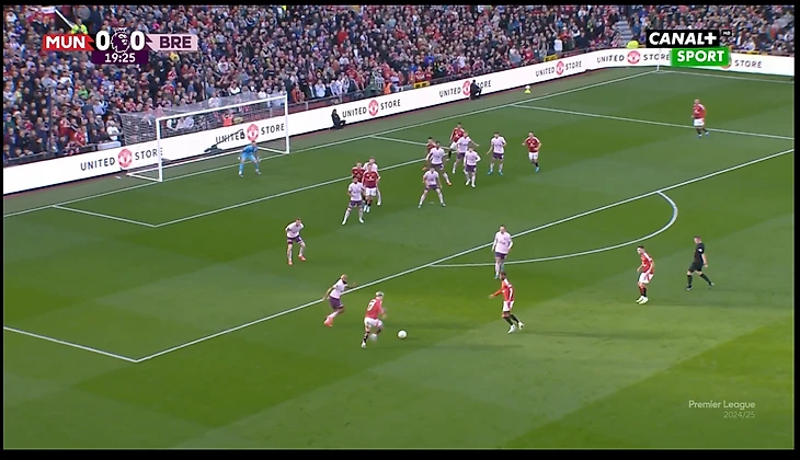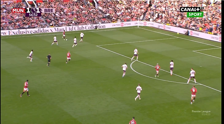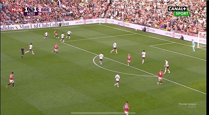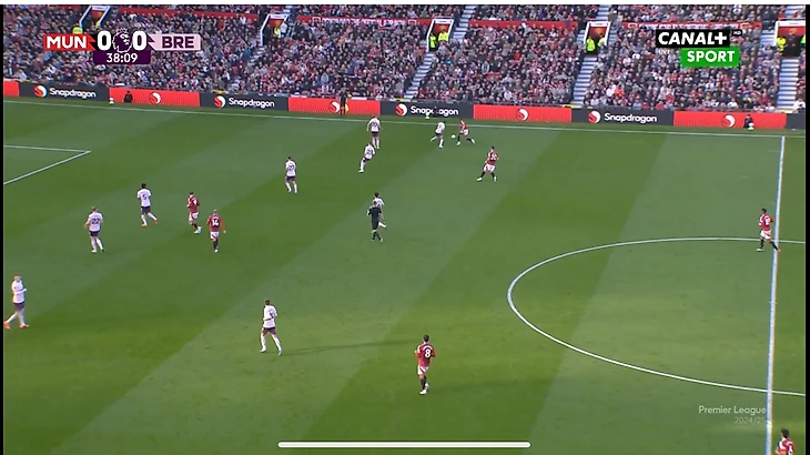 И вот расположение в моменте с голом. Далот очень высоко, Рэшфорд правый инсайд/форвард. Такая динамика усложняла оборону «Брентфорда» и благодаря такой конфигурации в купе с прекрасным исполнением стал возможен быстрый гол после перерыва.