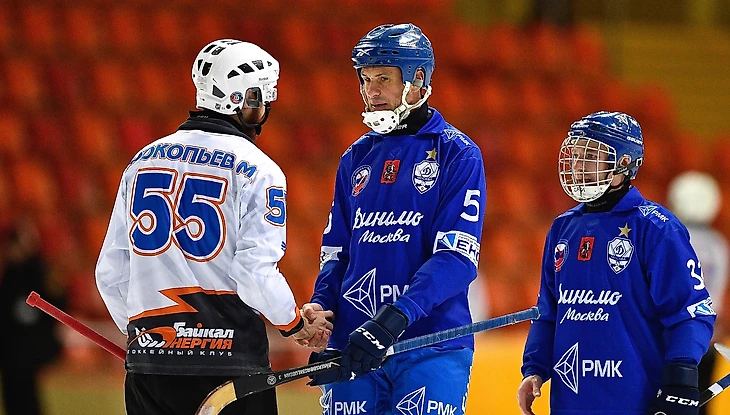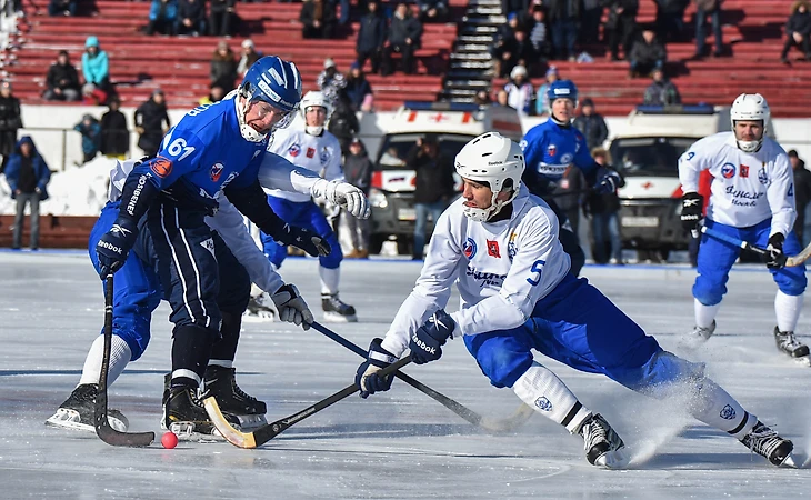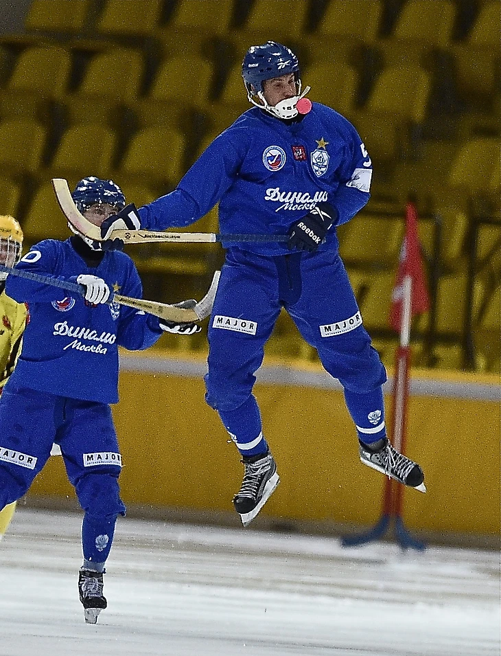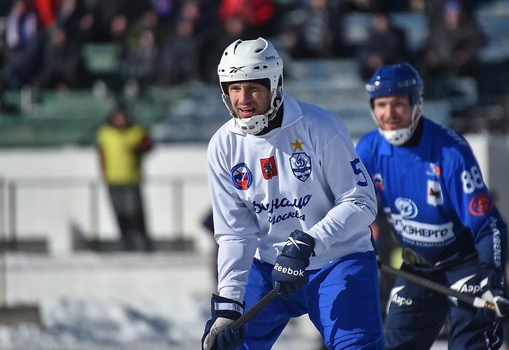 19 февраля 2017. Иркутск, стадион «Труд». Матч XXV чемпионата России «Байкал-Энергия» (Иркутск) — «Динамо» (Москва) — 9:4. Андрей Золотарев в противостоянии с полузащитником иркутян Тимофеем Безносовым
