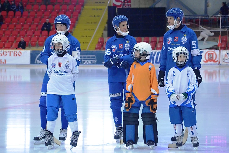 30 марта 2014. Москва, спорткомплекс «Крылатское». Перед финальным матчем чемпионата России «Динамо» (Москва) — «Енисей» (Красноярск) — 5:6. На фото слева направо: Александр Тюкавин, Михаил Свешников, Андрей Золотарев