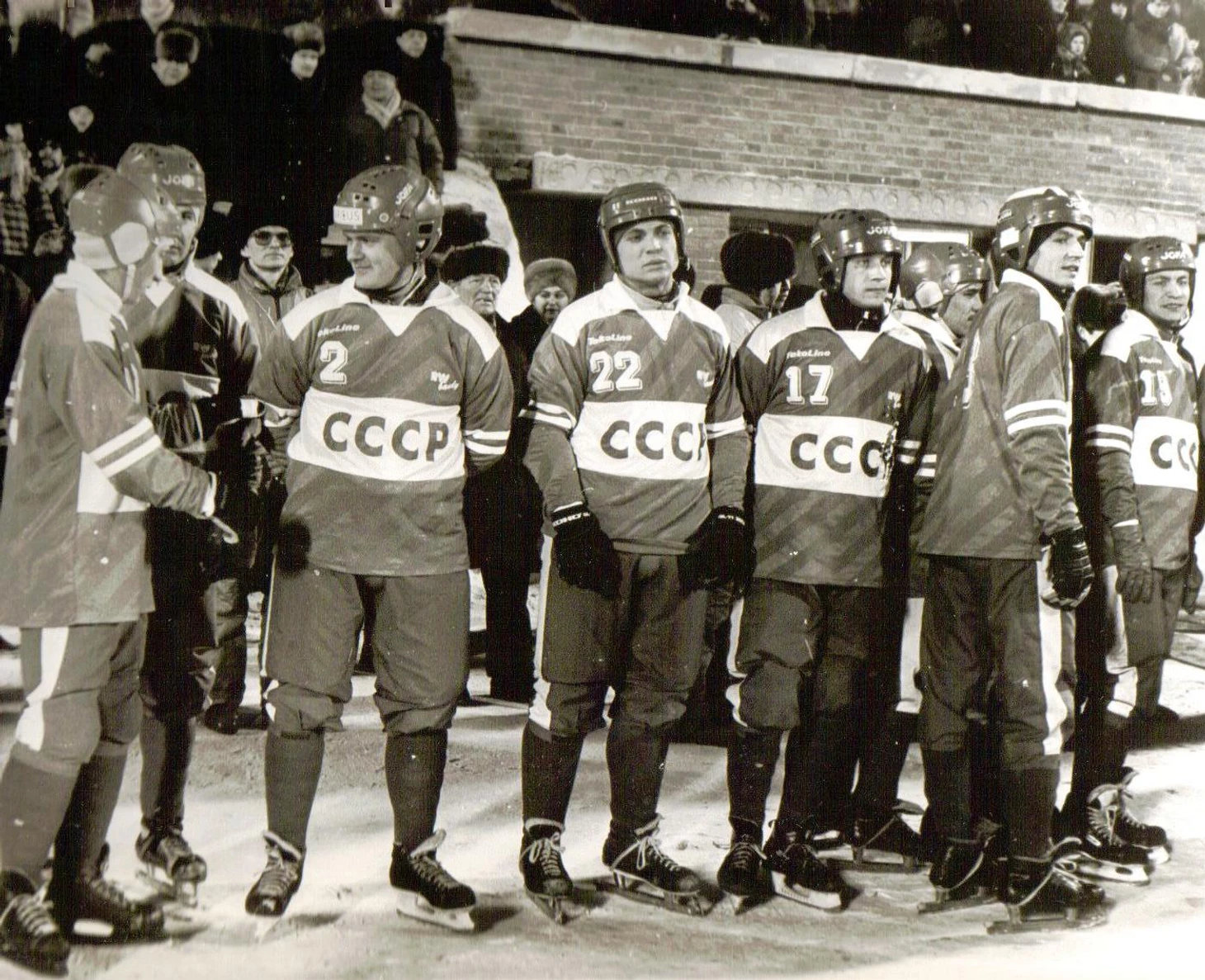 31 января 1990. Новосибирск, стадион «Сибсельмаш». Игроки сборной СССР Ирик Фасхутдинов, Александр Цыганов, Сергей Зимин, Валерий Савин, Александр Ямцов, Сергей Ин-Фа-Лин, Андрей Федосеев, Максим Потешкин на церемонии закрытия X Международного турнира на призы газеты «Советская Россия»