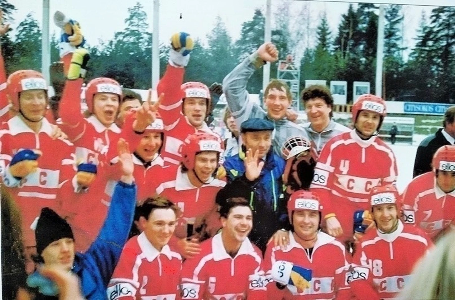 22 марта 1991. Хельсинки, стадион «Оулункюля». Выиграв в финальном матче у сборной Швеции 4:3, советские хоккеисты стали победителями XVII чемпионата мира. Первый ряд (слева направо): Павел Франц, Юрий Лахонин, Александр Цыганов, Вячеслав Архипкин. Второй ряд: Андрей Сизов, Алексей Дьяков, Евгений Георгиевич Манкос, Виктор Шакалин, Сергей Ломанов. Третий ряд: Максим Потешкин, Николай Ярович, Игорь Гапанович, Александр Господчиков, Михаил Лещинский