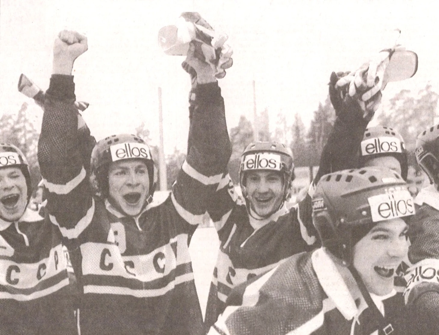 22 марта 1991. Хельсинки, стадион «Оулункюля». Игроки сборной СССР празднуют победу в финальном матче XVII чемпионата мира над сборной Швеции — 4:3. Слева направо: Николай Ярович, Максим Потешкин, Вячеслав Архипкин, Юрий Лахонин