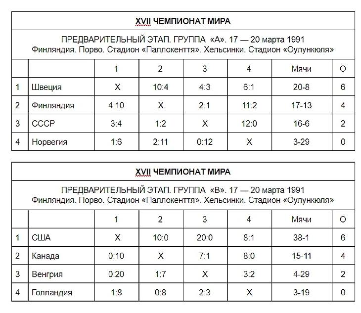 Ларчик открывался просто. Центром чемпионата, по замыслу организаторов, должен был стать искусственный каток «Каллио», расположенный в центре Хельсинки. Здесь и проходила встреча Швеция — Финляндия. Холодильные установки не выдержали натиска весны (термометр показывал плюс 10), и лед начал проваливаться. Когда табло отсчитало 43 минуты и 38 секунд, советский арбитр Евгений Богомазов по просьбе IBF прекратил игру: на отдельных участках поля уже проглядывала трава. Сами игроки пытались остановить матч уже по истечении четверти тайма. Зафиксированный к тому моменту счет 1:1 (ошибочно принятый за окончательный) был аннулирован. Поединок перенесли на стадион «Оулункюля», что в пригороде Хельсинки, и заново переиграли.