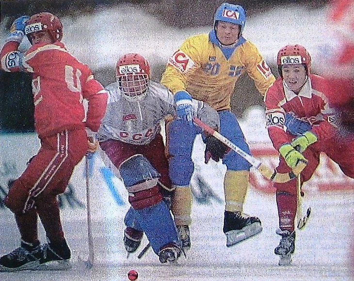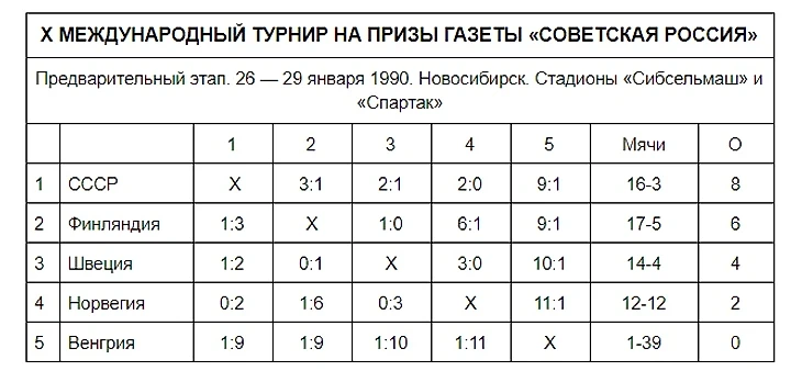 Советская сборная, пропустив уже на 4-й, а затем на 38-й минутах все время вынуждена была отыгрывать разницу в два мяча. На 49-й минуте Александр Цыганов делает разрыв минимальным, а уже через минуту Патрик Юханссон его восстанавливает — 1:3. На 76-й минуте Валерий Савин реализует 12-метровый — 2:3, но тот же Юханссон за четыре минуты до свистка оформляет хет-трик — 2:4. На последней минуте забивает Максим Потешкин, однако игровое время подходит к концу. Поражение — 3:4... В финале шведы не без труда одолели финнов — 4:2. В игре за третье место сборная СССР оторвалась на Норвегии (12:1), впрочем, какого-либо удовлетворения болельщикам эта победа уже не принесла... Впервые на турнире «Советской России» и второй раз в истории мы третьи.