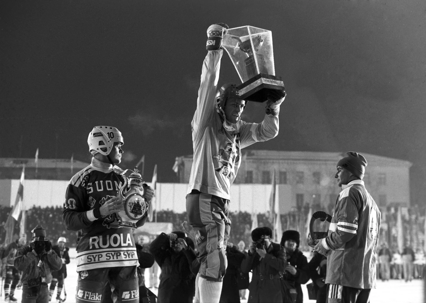 31 января 1990. Новосибирск, стадион «Сибсельмаш». Капитаны сборных Финляндии (Эско Таммилехто), Швеции (Ула Юханссон) и СССР (Виктор Шакалин) на награждении по итогам X Международного турнира на призы газеты «Советская Россия»