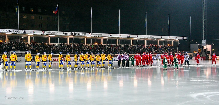 21 января 2009. Стокгольм, стадион «Зинкенсдамм». Перед началом матча предварительного турнира XXIX чемпионата мира Россия — Швеция — 2:2