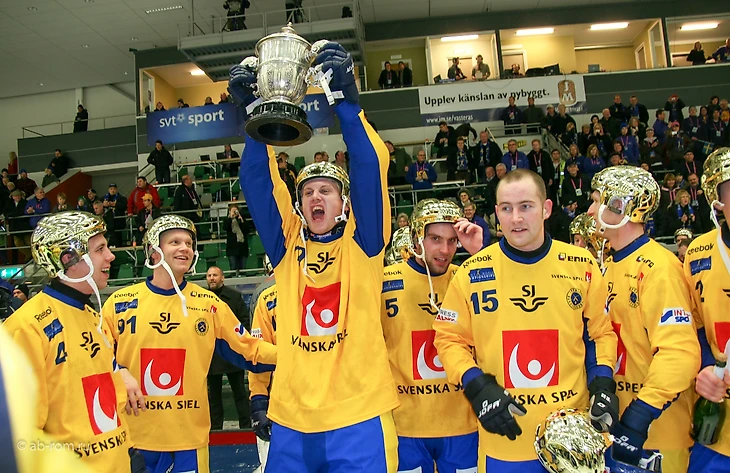 25 января 2009. Вестерос, «АББ Арена Юг». Хоккеисты сборной Швеции с кубком после победы в финальном матче XXIX чемпионата мира Россия — Швеция — 1:6. На фото слева направо: Пер Хельмюрс, Юхан Андерссон, Патрик Нильсон, Андреас Вест, Пер Хедквист, Стефан Эрикссон, Улов Энглунд