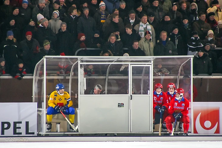 21 января 2009. Стокгольм, стадион «Зинкенсдамм». Матч предварительного турнира XXIX чемпионата мира Россия — Швеция — 2:2. На скамейке штрафников (слева направо) игроки сборной Швеции (Андреас Вест) и России (Иван Максимов, Павел Булатов и Дмитрий Савельев)