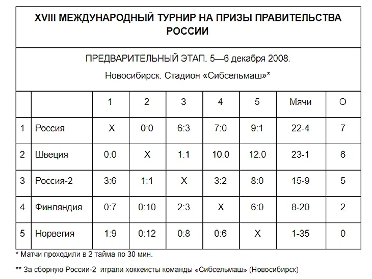Три дня (7—9 декабря) в Новосибирске было не очень холодно, зато очень снежно. На предварительном этапе главные хоккейные монстры — сборные России и Швеции за 60 минут (матчи проводились в формате 2х30 минут) не забили друг другу ни разу! В серии пенальти шведы выиграли 3:1, но в финале, который был уже полноценным, наша молодая команда взяла реванш — 3:2.