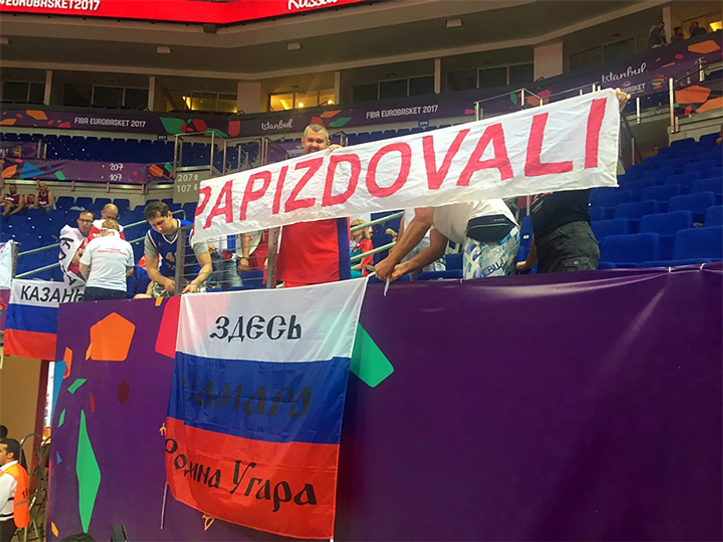 Идея баннера «Papizdоvali» родилась после чемпионата 2007-го года. Перед Пекином мы решили, чтобы это не было оскорбительно (мы русский прекрасно знаем, знаем, что вторая буква должна быть «о»), нужно сделать «а»: чтобы это не было ругательным словом.