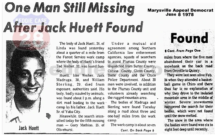 Еще через два дня отец Джека Хюэтта, также участвующий в экспедиции, обнаружил позвоночник сына в трех километрах к северо-востоку от трейлера. Само тело опознали по обуви и джинсам. В ста метрах от тела на следующий день нашли и череп Хюэтта. Семейный стоматолог подтвердил, что это действительно он, по зубам.