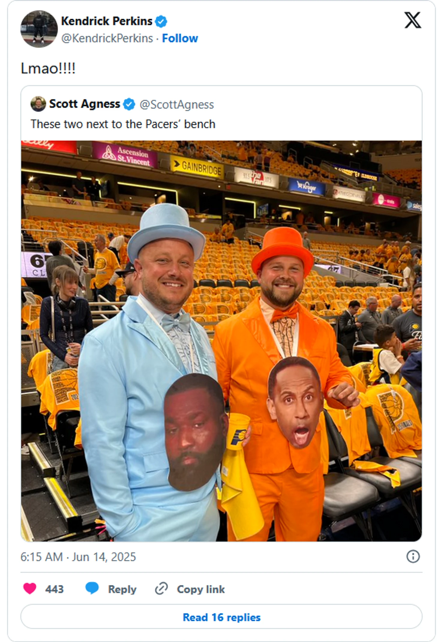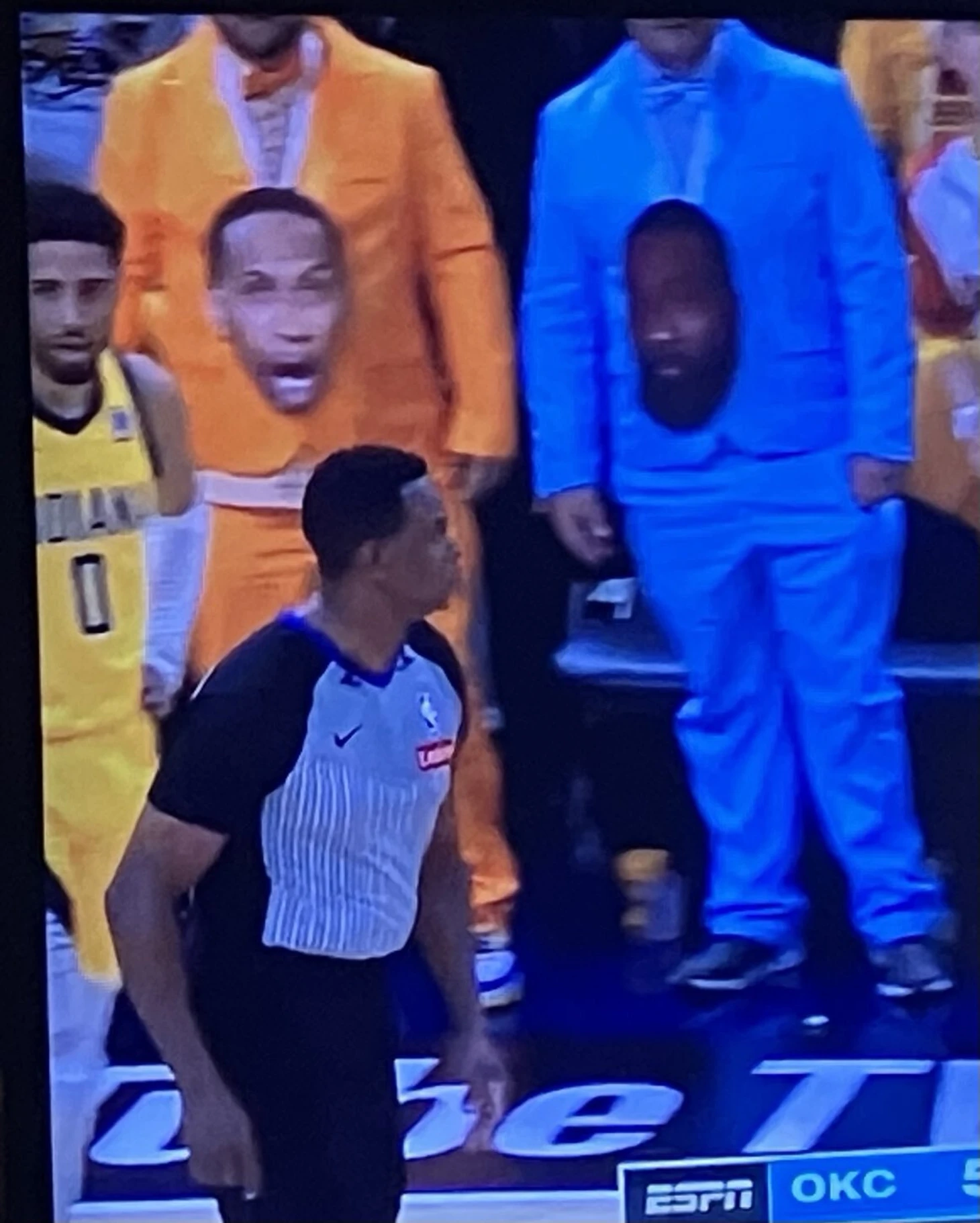 Операторам четвертого матча финальной серии пришлось постараться, но сделать невозможное они не смогли: за спиной главного тренера «Пэйсерс» Рика Карлайла постоянно маячили два типа с первого ряда, облаченные в яркие костюмы из фильма «Тупой, еще тупее». Болельщики не просто переоделись в легендарных персонажей Джима Кэрри и Джефф Дэниэлса, но и повесили на себя изображения ведущих ESPN Стивена Эй Смита и Кендрика Перкинса, которым и была посвящена эта эскапада. Они попадали в кадр чуть ли не в каждом владении и уж точно, когда камеры пытались поймать реакцию Рика Карлайла (этого Джима Кэрри НБА).