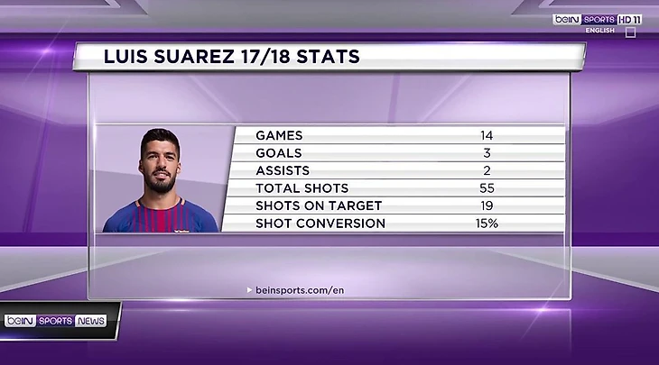 Статистика Луиса Суареса в сезоне 2017/18: три гола в четырнадцати матчах.