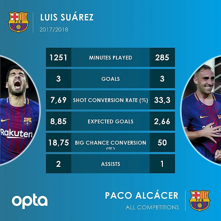 Кто бы мог подумать, но кандидатура Пако Алькасера в стартовом составе "Барселоны" сейчас выглядит куда более предпочтительной. У испанца также три гола, но при этом он провел на поле в четыре раза меньше времени, чем Суарес.
